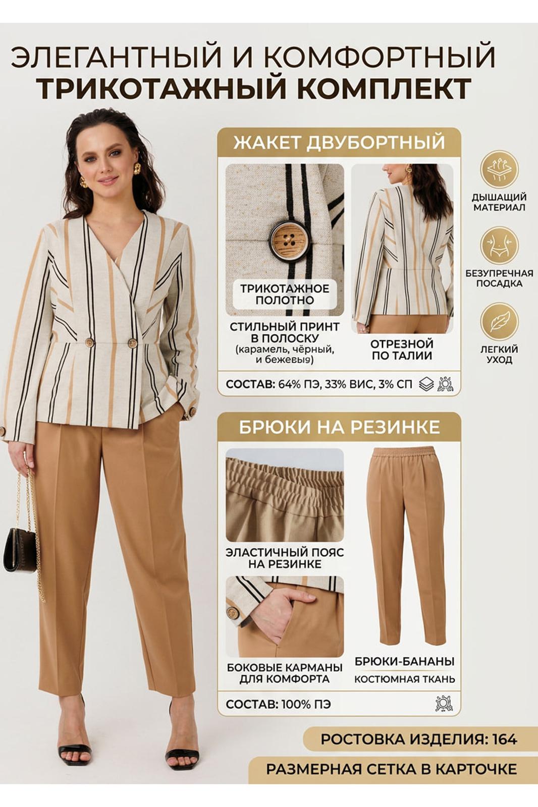 Костюм женский, состоящий из трикотажного жакета без подкладки и брюк. Жакет полуприлегающего силуэта, отрезной по линии талии, с двухбортной застежкой. Перед с рельефами и почками, выкроенными по косой. Спинка с центральным швом, с рельефами и бочками по косой. Рукав втачной, одношовный, внизу со складкой и декоративной пуговицей. Брюки из костюмной ткани, зауженные к низу, на резинке. У брюк пояс на резинке, боковые карманы, имитация гульфика.