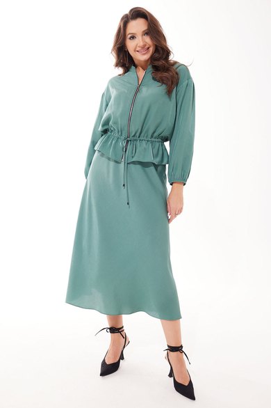 Костюм женский состоящий из блузы и юбки. Блуза прямого силуэта, на кулисе. Застежка - молния. У блузы втачной воротник-стойка, спущенное плечо, рукав втачной. По низу рукава - резинка. Юбка А-силуэта, верхний срез обработан широкой резинкой.