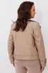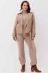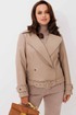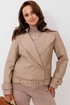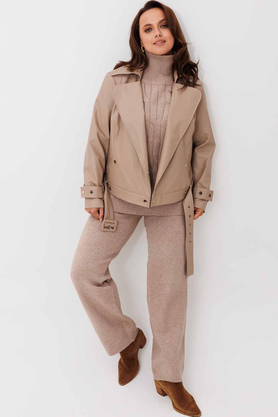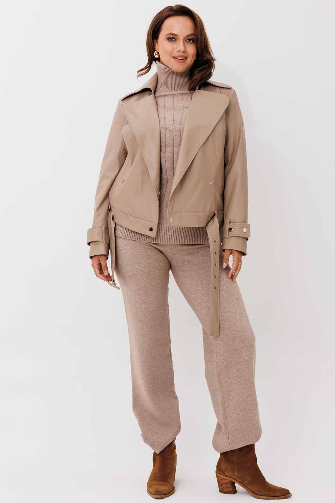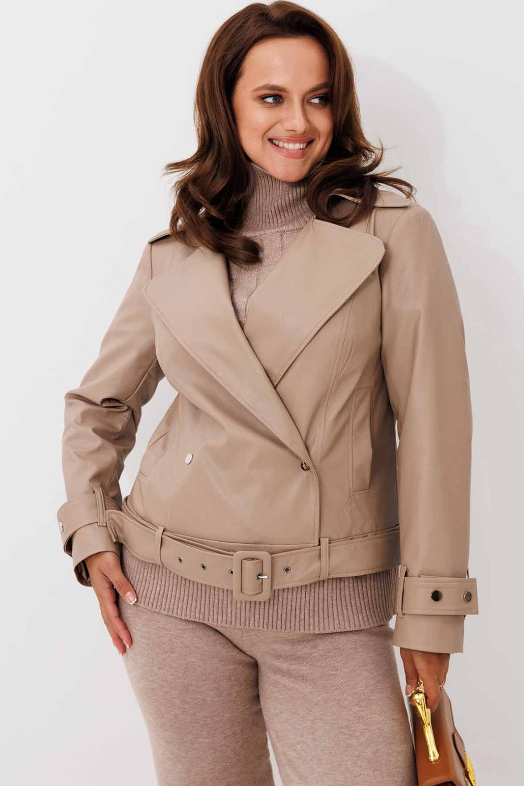 Жакет женский, укороченная, прямого силуэта на подкладке, выполнена из качественной экокожи. Застёжка двубортная на кнопки. По переду рельефы от плеча до низа и прорезные карманы с листочкой. Спинка с рельефами от плеча до низа. По низу куртки приточная планка со шлёвками, в которые продет пояс с пряжкой. Воротник отложной на стойке. Рукава двух шовные втачные, по низу паты продеты в шлёвки на кнопках.