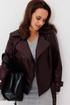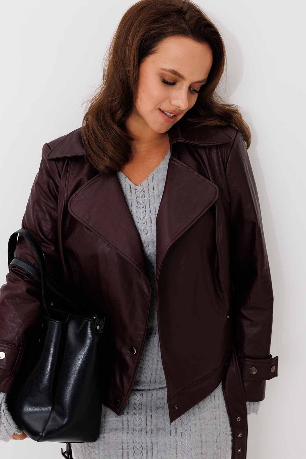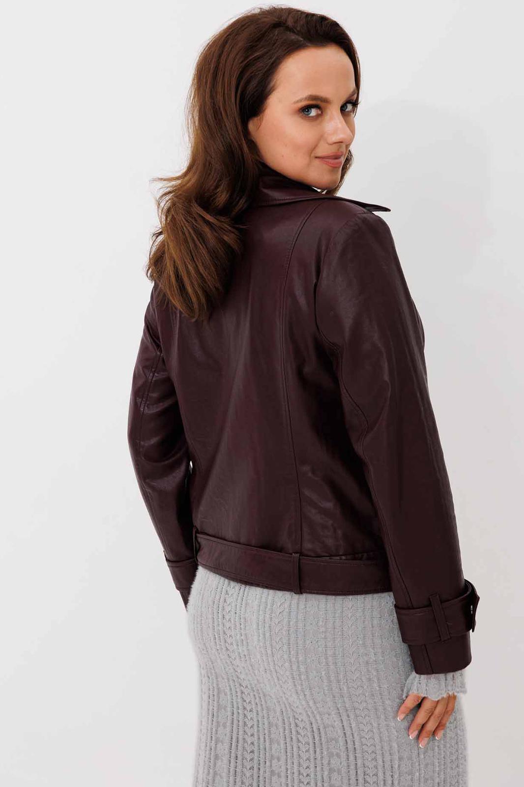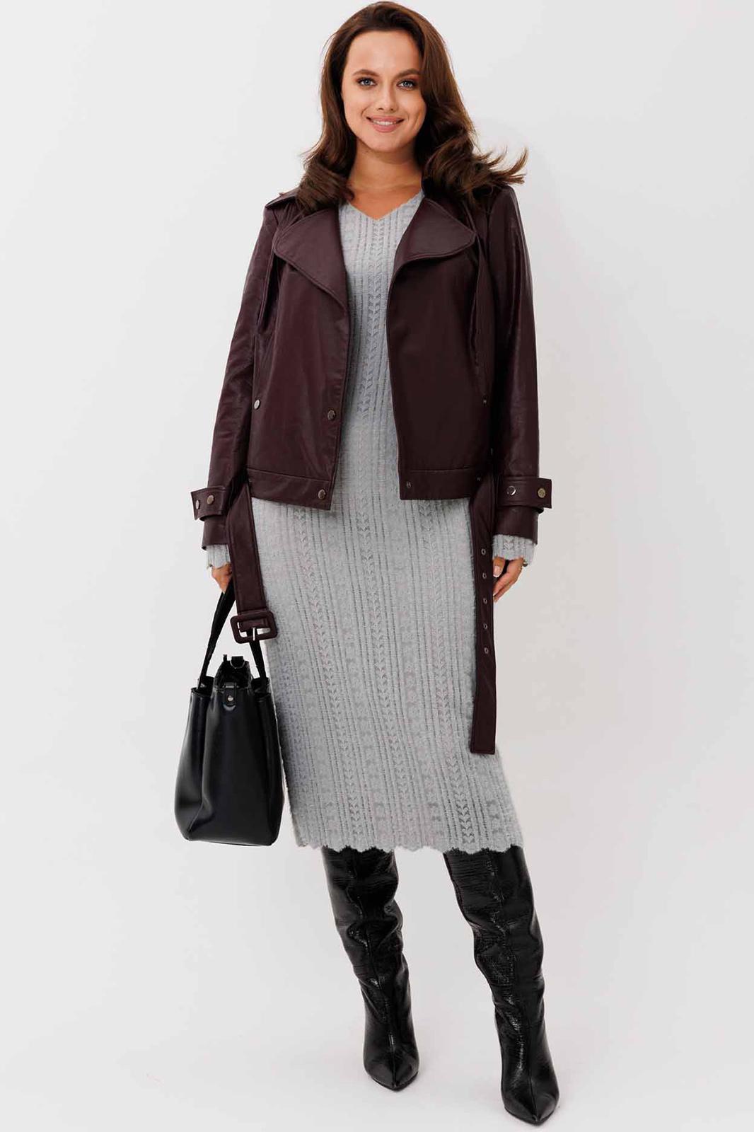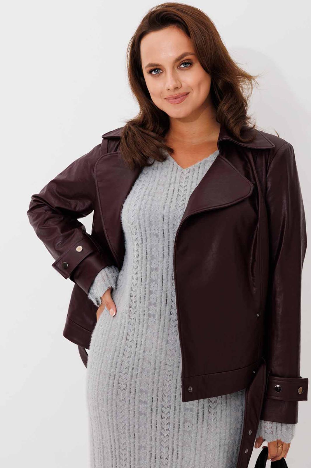 Жакет женский, укороченная, прямого силуэта на подкладке, выполнена из качественной экокожи. Застёжка двубортная на кнопки. По переду рельефы от плеча до низа и прорезные карманы с листочкой. Спинка с рельефами от плеча до низа. По низу куртки приточная планка со шлёвками, в которые продет пояс с пряжкой. Воротник отложной на стойке. Рукава двух шовные втачные, по низу паты продеты в шлёвки на кнопках.