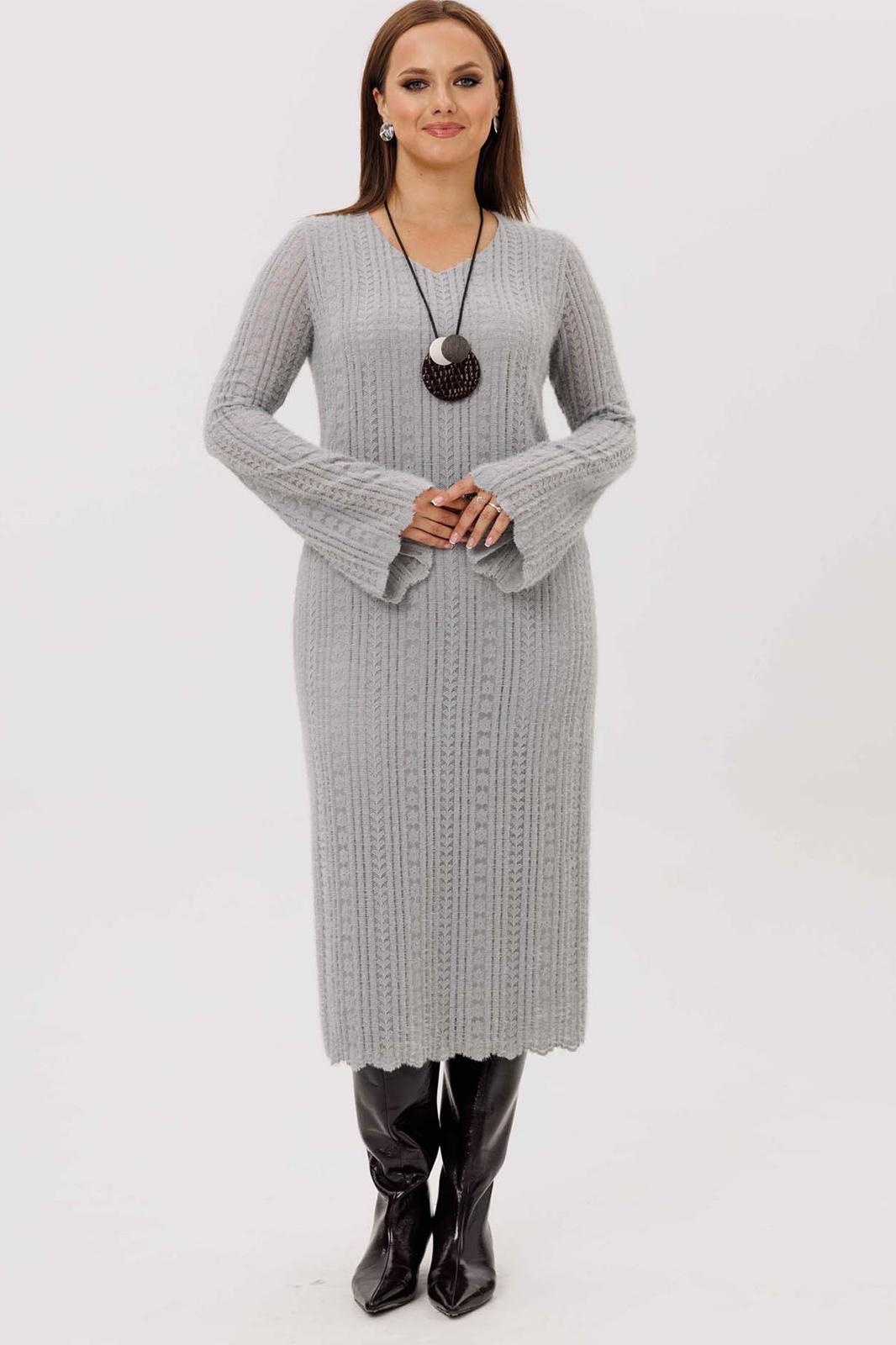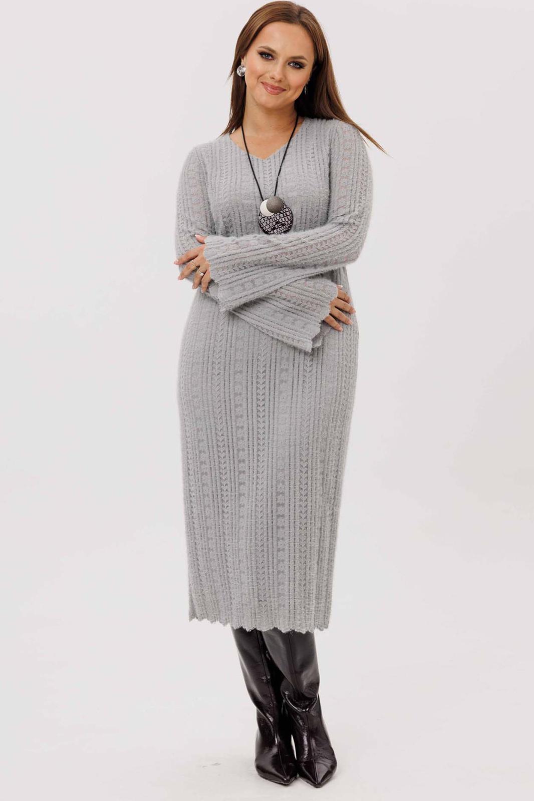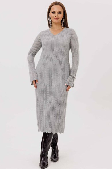 Платье трикотажное на подкладке. Платье выполнено из трикотажного полотна с ажурным (кружевным) рисунком. Полотно средней плотности, эластичное, с мягким прилеганием по фигуре. Изделие полуприлегающего силуэта, длиной миди, с V-образным вырезом горловины и длинным втачным рукавом. Низ рукавов и низа изделия обработан фигурным краем полотна, что придаёт модели завершённый декоративный акцент. Для комфортной посадки предусмотрена трикотажная подкладка по всей длине изделия.