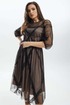 Платье женское отрезное по линии талии расклешённое к низу выполнено из двух видов ткани. Верхний слой платья выполнен из ткани тонкая сетка в мелкий горошек. Горловина круглая. По переду кокетка и талевые вытачки. По спинке лифа кокетка , центральный шов и застёжка на воздушную петлю и пуговицу. Рукава втачные одно шовные со сборкой по низу на тонкую резинку. Украшает изделие кружево.