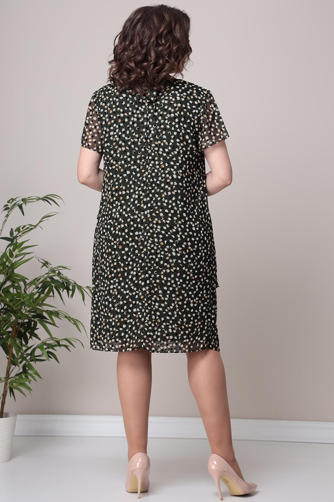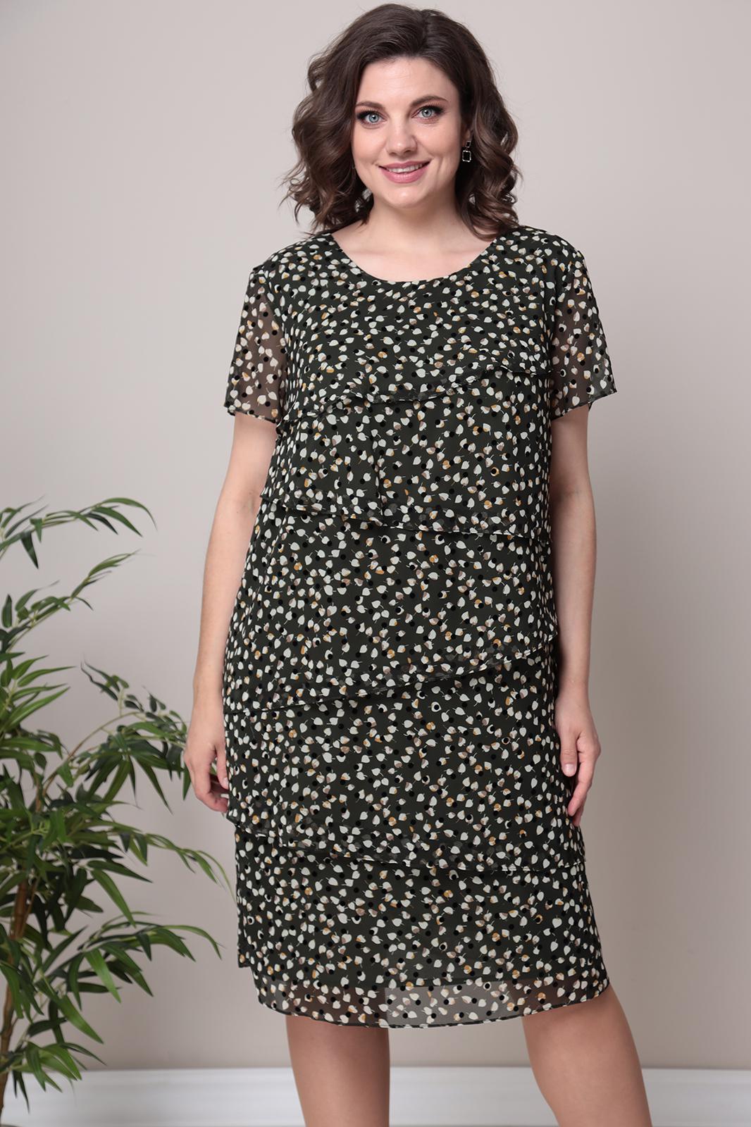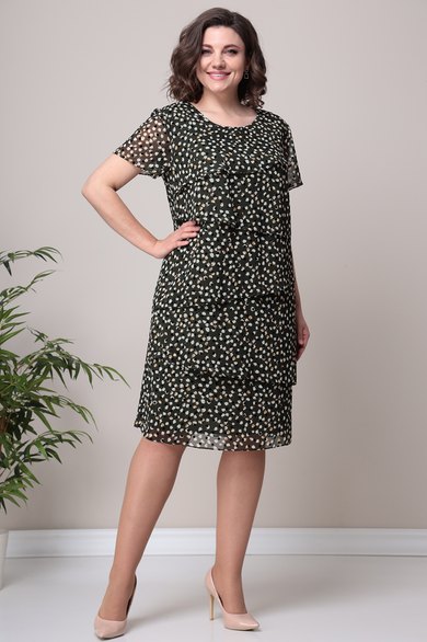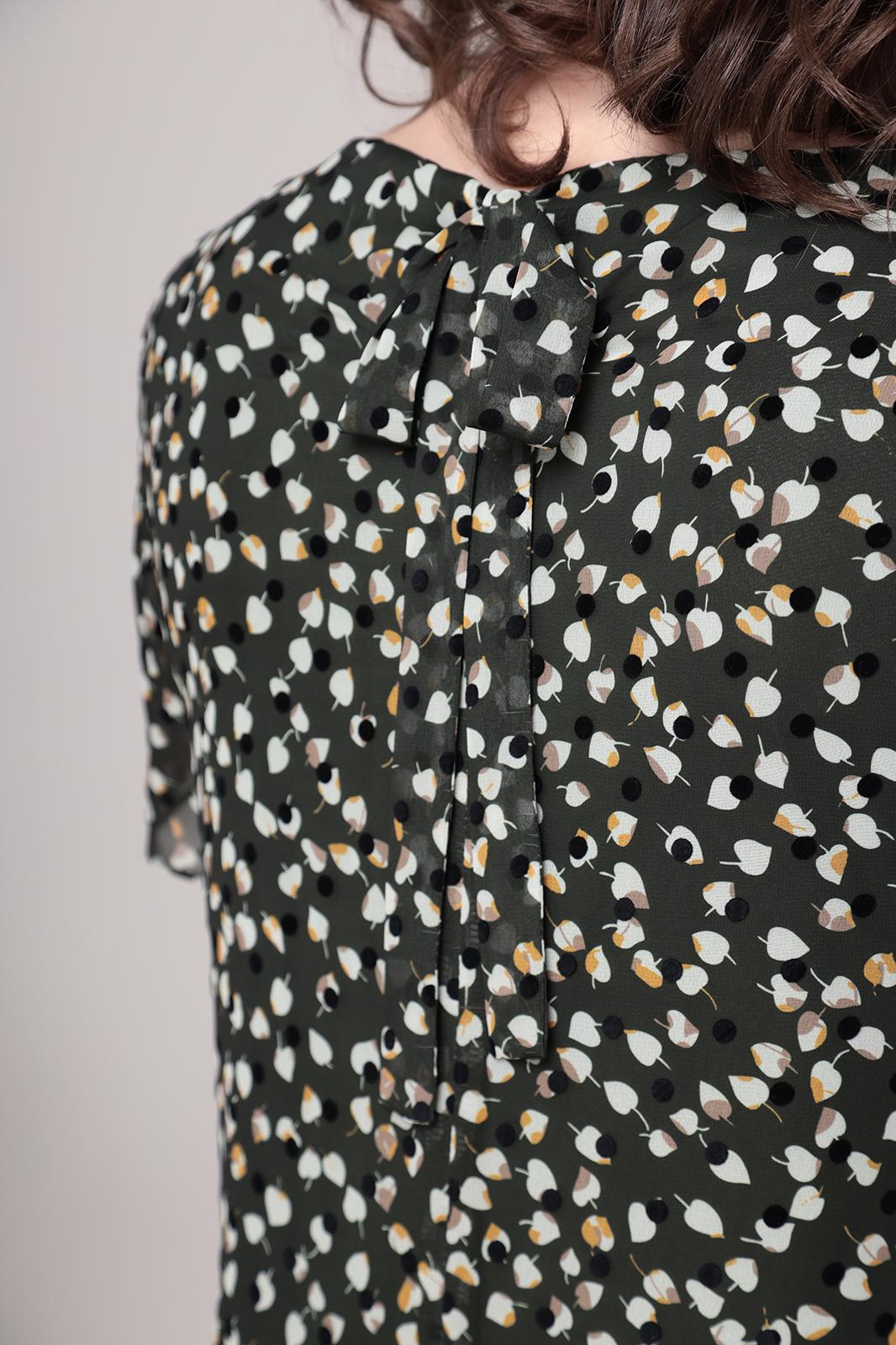 Платье женское прямого силуэта, на подкладке, тесьма-молния в левом боковом шве. Перед с диагональными подрезами: начинается слева от проймы до правого бокового шва, 5 ярусов, соединены по верхнему срезу с подкладкой, низ отлетной. Спинка со средним швом, без вытачек. Рукав втачной, одношовный. Горловина форма лодочка, по горловине спинки пришиты завязки, завязаны на бантик. Длина изделия 102 см, рукав 19 см.