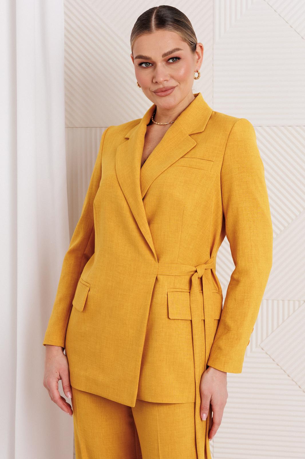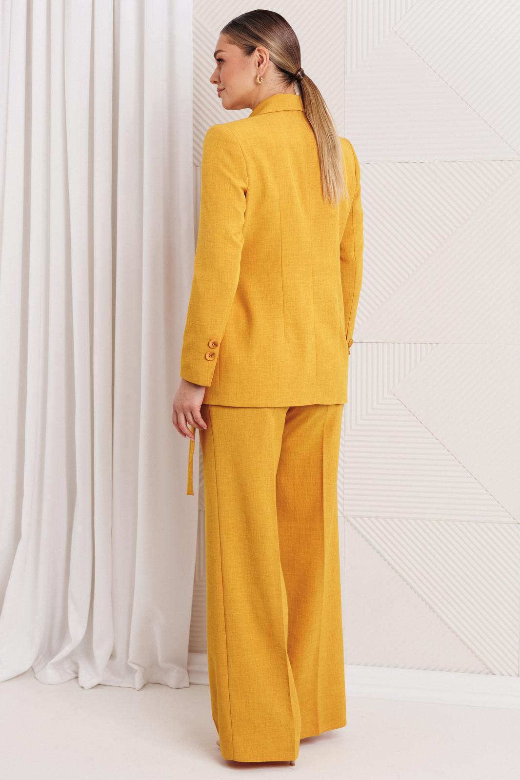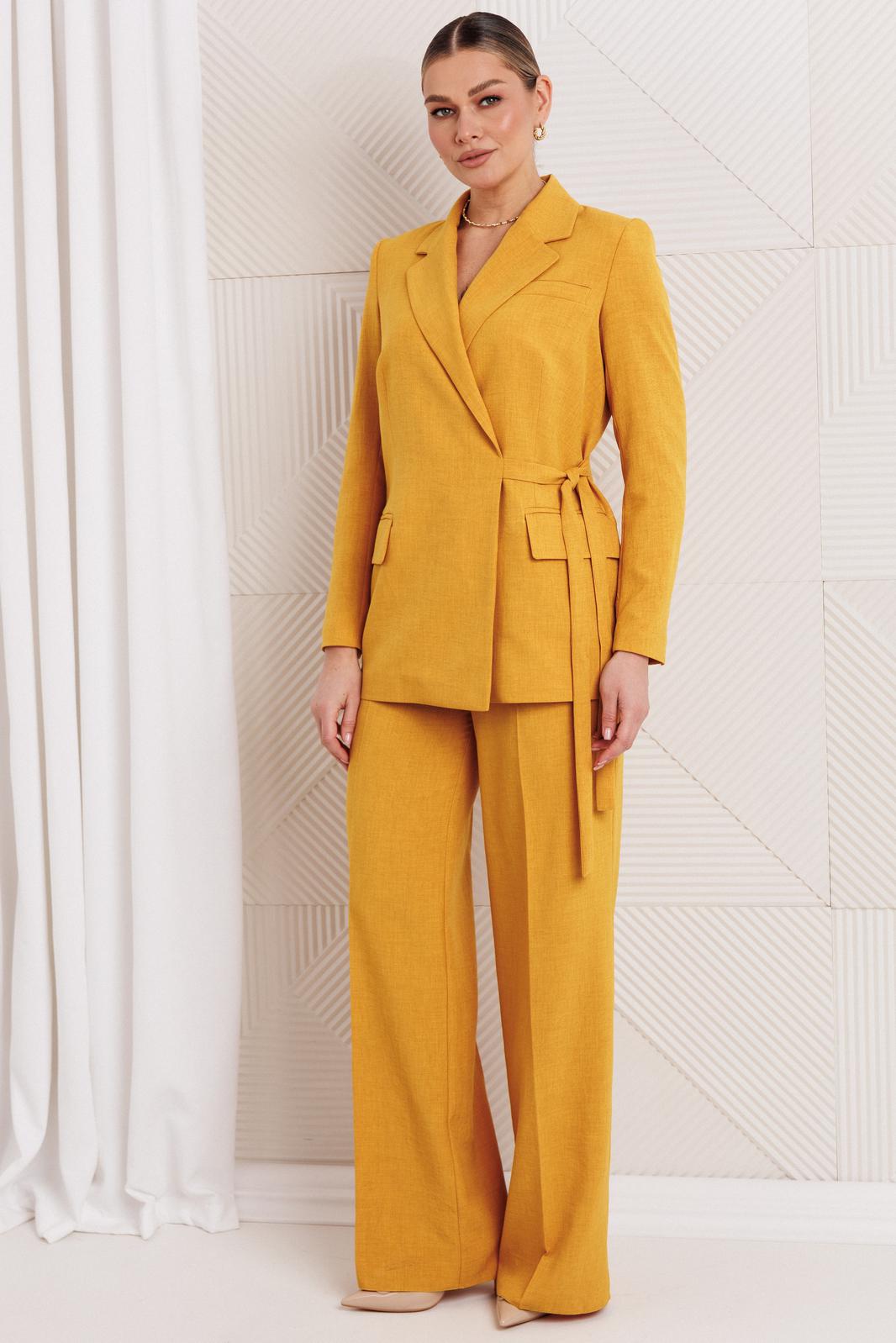 Женский трендовый костюм, состоящий из жакета и брюк. Жакет полуприлегающего силуэта, удлиненный, со смещенной бортовой застежкой на завязку и потайную пуговицу. По переду талиевые вытачки, выходящие от горизонтальных подрезов, в которых обработаны карманы в рамку с клапанами. На груди обработана листочка, имитирующая нагрудной карман. Спинка со средним швом и талиевыми вытачками. Рукав втачной, двухшовный, со шлицей. На шлицах по две декоративных пуговиц. Воротник пиджачного типа. Жакет на подкладке. Брюки на притачном поясе с резинкой, прямые, со складкой по талии и с заутюженными кантами. По бокам обработаны карманы. Брюки с завышенной талией, свободной формы, выгодно подчеркивают изящность ног и придают fashion-нотку образу. Удобная в носке ткань, хорошая посадка по фигуре, универсальность и лаконичность модели не оставят равнодушной ни одну женщину.
