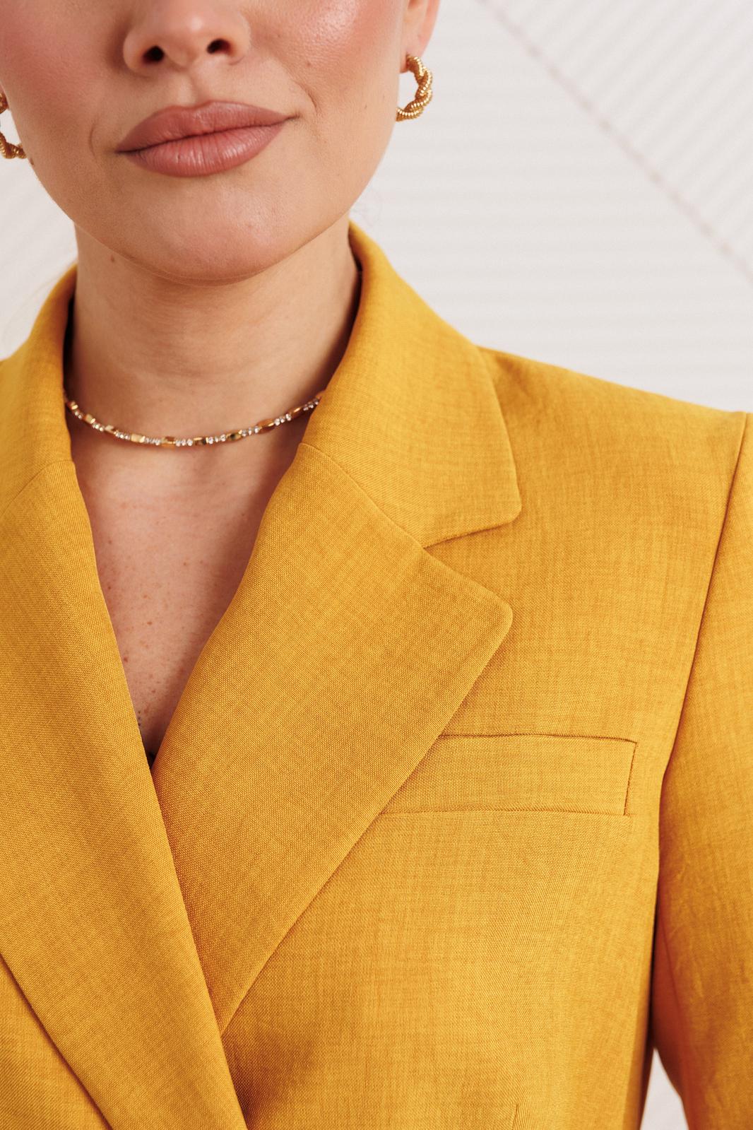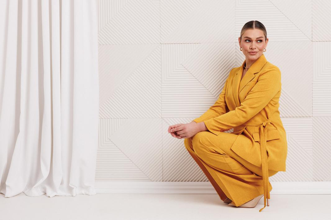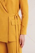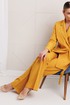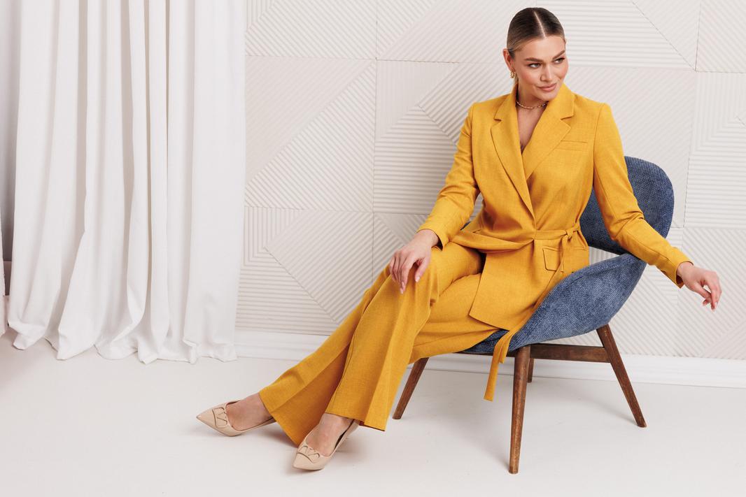 Женский трендовый костюм, состоящий из жакета и брюк. Жакет полуприлегающего силуэта, удлиненный, со смещенной бортовой застежкой на завязку и потайную пуговицу. По переду талиевые вытачки, выходящие от горизонтальных подрезов, в которых обработаны карманы в рамку с клапанами. На груди обработана листочка, имитирующая нагрудной карман. Спинка со средним швом и талиевыми вытачками. Рукав втачной, двухшовный, со шлицей. На шлицах по две декоративных пуговиц. Воротник пиджачного типа. Жакет на подкладке. Брюки на притачном поясе с резинкой, прямые, со складкой по талии и с заутюженными кантами. По бокам обработаны карманы. Брюки с завышенной талией, свободной формы, выгодно подчеркивают изящность ног и придают fashion-нотку образу. Удобная в носке ткань, хорошая посадка по фигуре, универсальность и лаконичность модели не оставят равнодушной ни одну женщину.