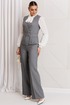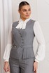 Комплект женский, состоящий из брюк и жилета. Жилет полуприлегающего силуэта с рельефами по переду и спинке, отрезной по линии талии. Низ жилета ассиметричной формы. На баске с одной стороны обработаны прорезные карманы в рамку, один из которых функциональный. Застежка двубортная на петли-пуговицы и декоративную пату. Жилет на подкладке. Брюки прямые, сверху на притачном поясе, сзади с резинкой. На передних половинках обработаны карманы. Застежка на тесьму-молнию. Данный комплект можно дополнить блузой, что позволит Вам создать разные образы.