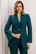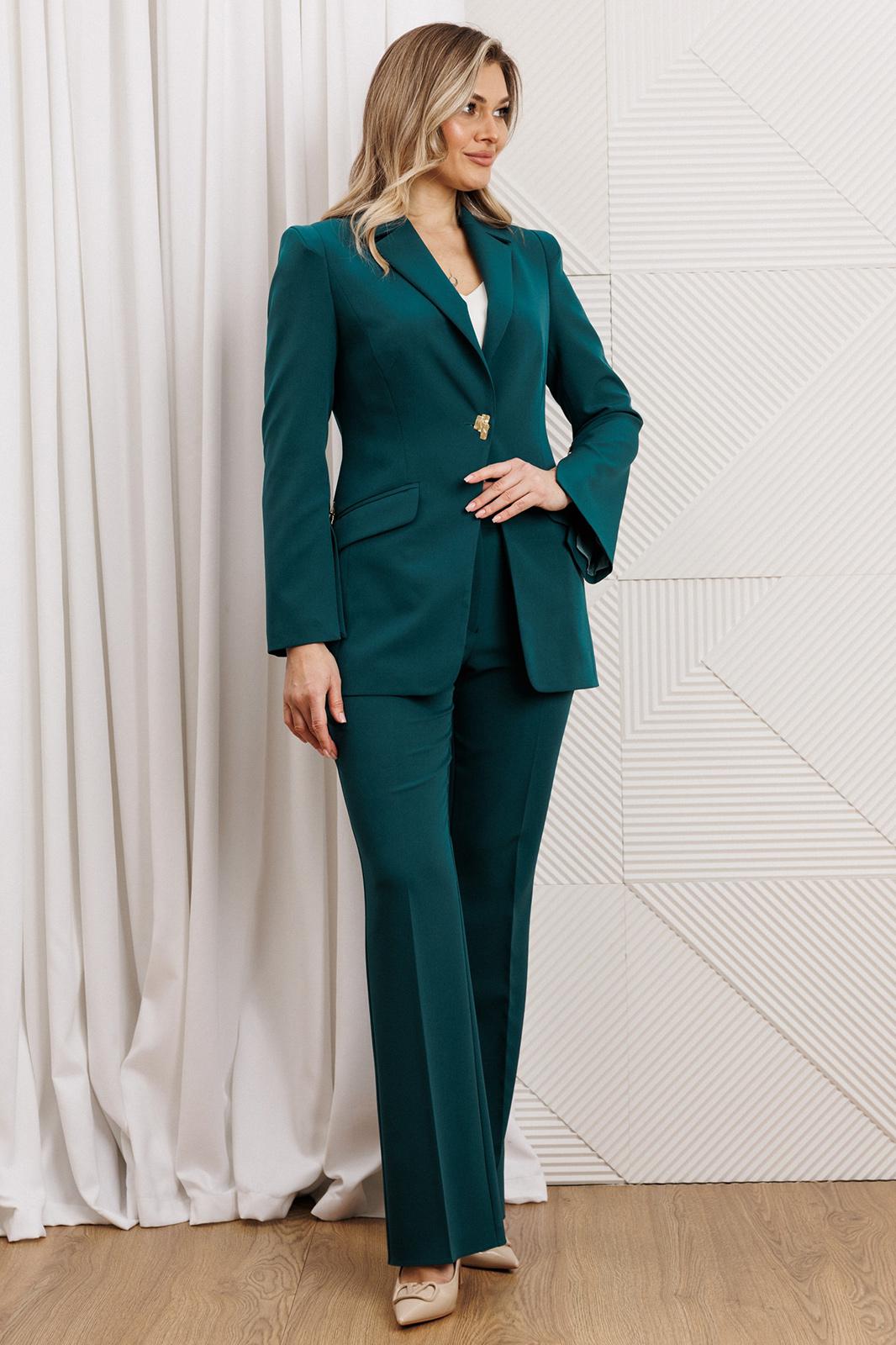 Деловой комплект, состоящий из жакета и брюк. Жакет - воплощение стильной трансформации. Его классический крой выполнен из безупречной костюмной ткани, но в деталях скрывается своенравный характер. Жакет полуприлегающего силуэта. Модель отличается аккуратным кроем и стильными деталями. На передней части жакета обработаны вертикальные рельефы, идущие от проймы до уровня кармана и от кармана до низа, что придаёт силуэту выразительность и стройность. Воротник пиджачного типа добавляет классической элегантности. Застёжка центральная бортовая на петлю-пуговицу. Карманы в рамке с клапанами, гармонично расположены на передней части жакета. Спинка с центральным швом и вертикальными рельефами, идущими от проймы. Рукава двухшовные с отрезной деталью по окату и разрезами внизу добавляют свободы движению и делают модель более интересной. Жакет на подкладке. Брюки с высокой посадкой, по линии талии – притачной пояс, в боковых швах резинка. Застежка на молнию.