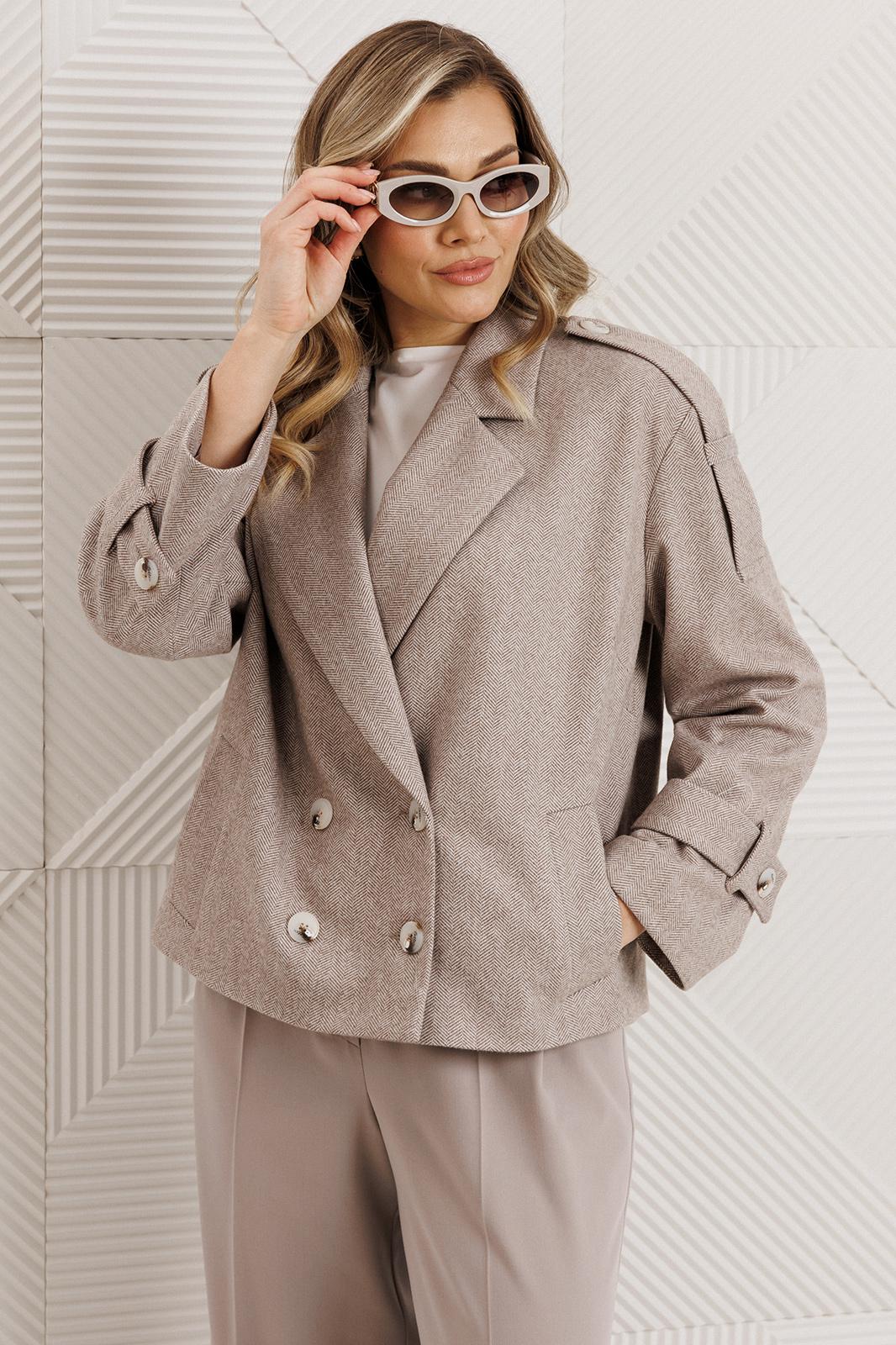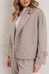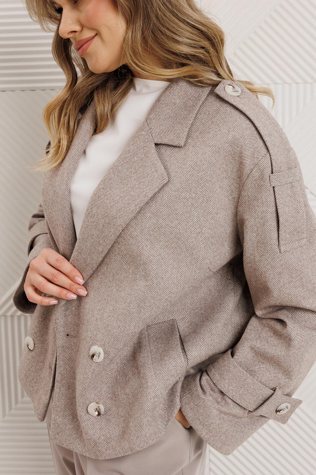 Универсальный комплект на межсезонье! Полупальто свободного силуэта с воротником пиджачного типа, с двубортной застёжкой на 2 пары пуговиц. По переду обработаны карманы и нагрудные вытачки. Спинка без среднего шва. Рукава одношовные с патами внизу,которые фиксируются шлёвками и пуговицами. На линии плеч:погоны-фиксируются шлёвками и пуговицами. Изделие на подкладке.