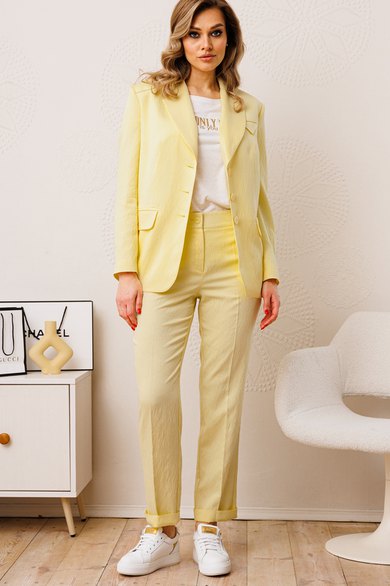 Комфортный костюм с брюками от бренда М О Д А - Ю Р С в нежных тонах. Свободный крой и приятный материал - отличный выбор для делового гардероба. Жакет прямого силуэта, на полочках обработаны карманы с клапанами. Спинка со средним швом. Воротник пиджачного типа. Рукав двухшовный со шлицей, который декорирован пуговицами. Застежка центральная на петли-пуговицы. Брюки прямые, со стрелками и карманами. Верх брюк на притачном поясе-кокетке. Застежка на тесьму-молнию в среднем шве. Жакет на подкладке.