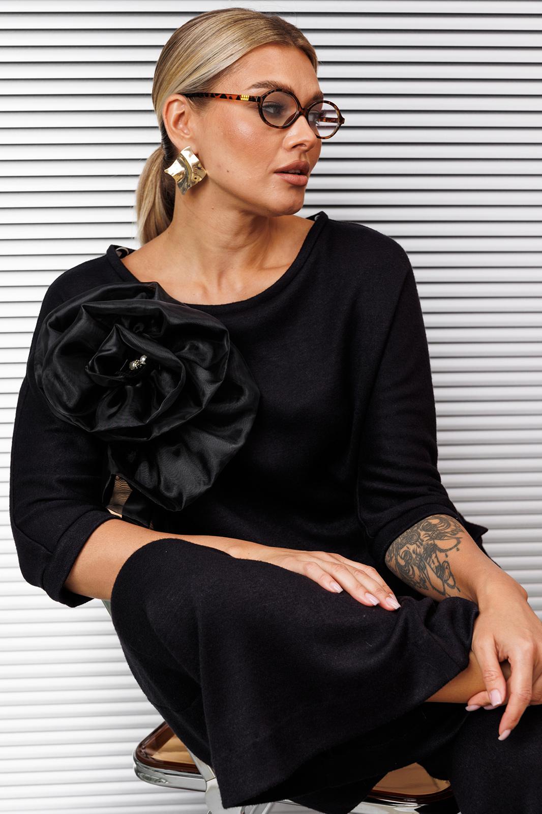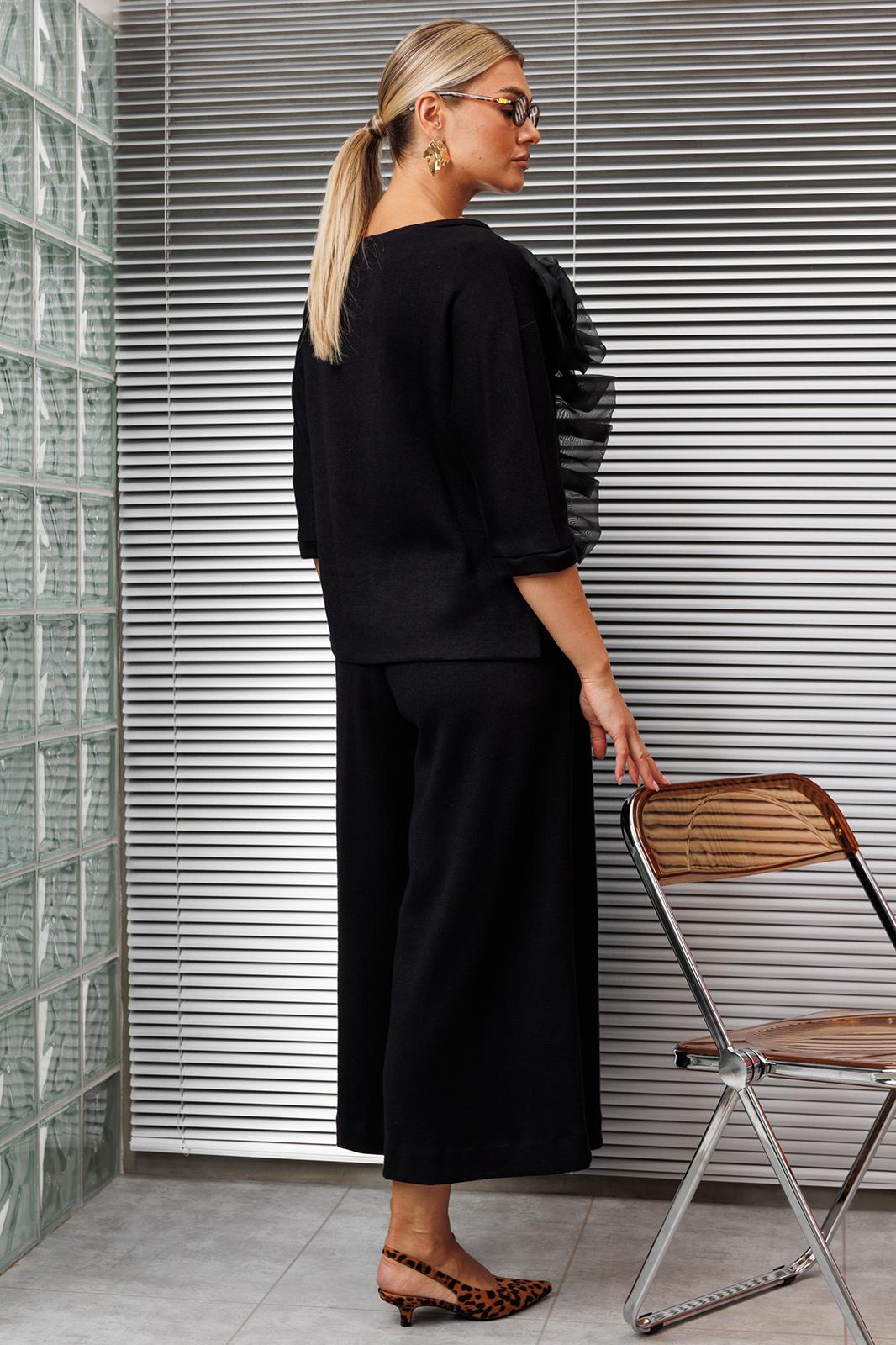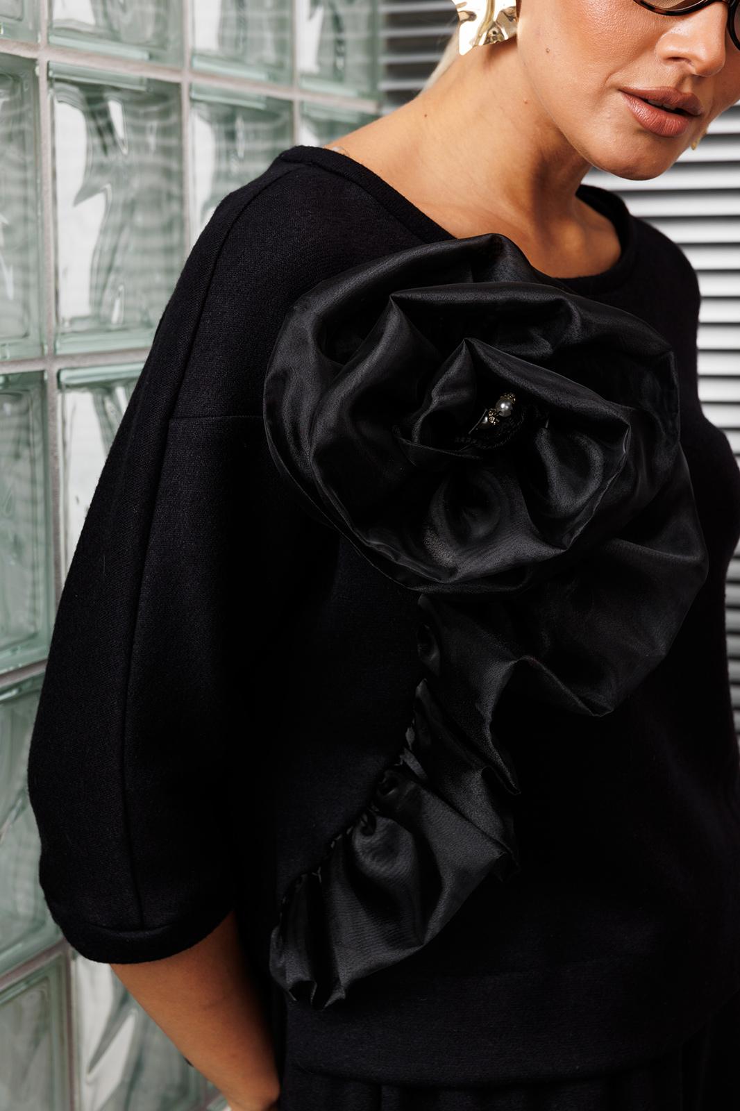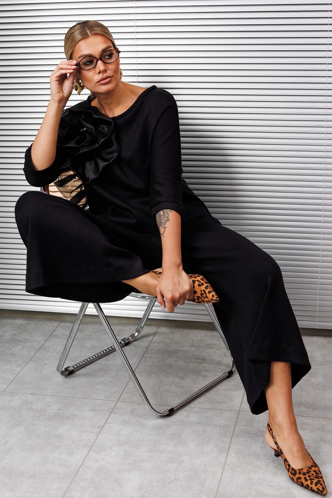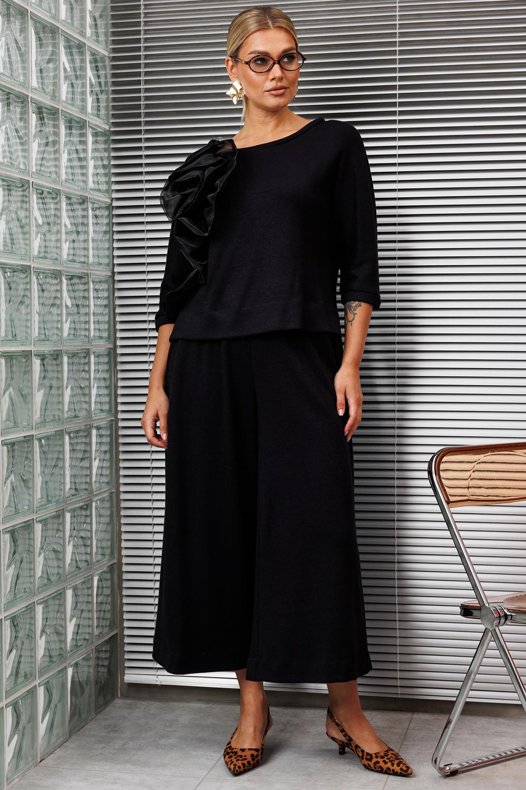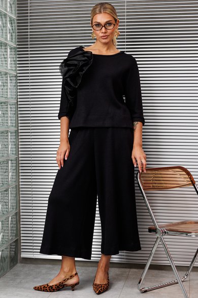 Создать нарядный образ с брюками легко! Легко это осуществить с нашей новой моделью. Костюм состоит из блузы и юбки-брюк. Используемый материал тонкий, струящийся трикотаж, имеющий в составе ангору. Блуза свободного кроя, “летучая мышь”, по низу с перепадом длины. Перед декорирован акцентным дизайнерским цветком из органзы. Юбка-брюки свободного кроя с резинкой на талии.