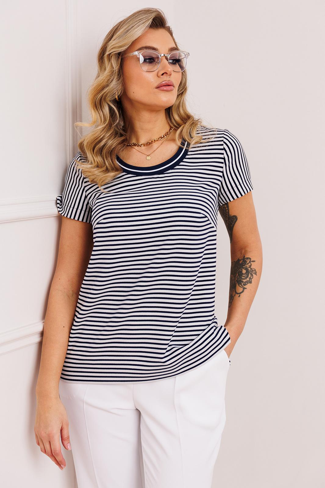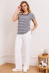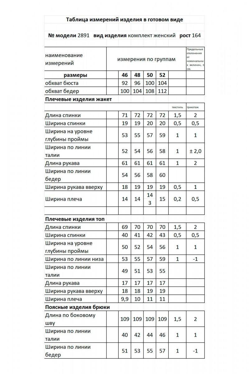 Трехпредметный комплект, который состоит из жакета, топа и брюк. Жакет полуприлегающего силуэта, с талиевыми вытачками. Спинка со средним швом. Рукав втачной, двухшовный. Воротник пиджачного типа. Застежка центральная на петли-пуговицы. Топ прямого силуэта, по бокам с разрезами. Рукав одношовный. Вырез горловины округлой формы с довязом по переду. Брюки прямые, чуть зауженные к колену, спереди с карманами, сверху на притачном поясе, сзади с резинкой.