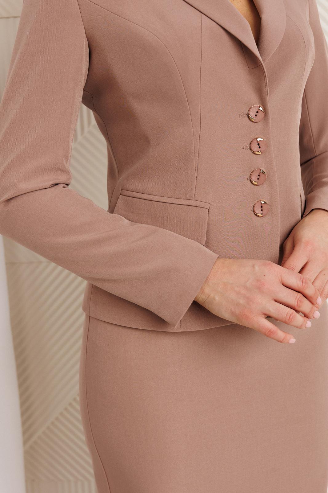 Хит этой осени, стильный и элегантный костюм, состоящий из жакета и юбки. Жакет прилегающего силуэта выполнен по переду и спинке с рельефами, выходящими из проймы. На полочке обработаны карманы в рамку с клапаном. Спинка со средним швом. Рукав втачной двухшовный. Воротник пиджачного типа. Застежка центральная на петли с пуговицами. Юбка прямая, зауженная к низу, на притачном поясе с резинкой. Застежка на тесьму-молнию в среднем шве, который переходит в шлицу. Жакет и юбка на подкладке.