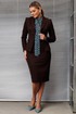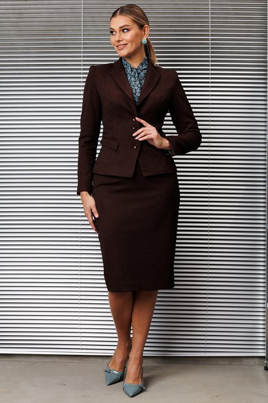 Хит этой осени, стильный и элегантный костюм, состоящий из жакета и юбки. Жакет прилегающего силуэта выполнен по переду и спинке с рельефами, выходящими из проймы. На полочке обработаны карманы в рамку с клапаном. Спинка со средним швом. Рукав втачной двухшовный. Воротник пиджачного типа. Застежка центральная на петли с пуговицами. Юбка прямая, зауженная к низу, на притачном поясе с резинкой. Застежка на тесьму-молнию в среднем шве, который переходит в шлицу. Жакет и юбка на подкладке.