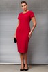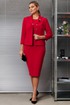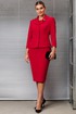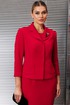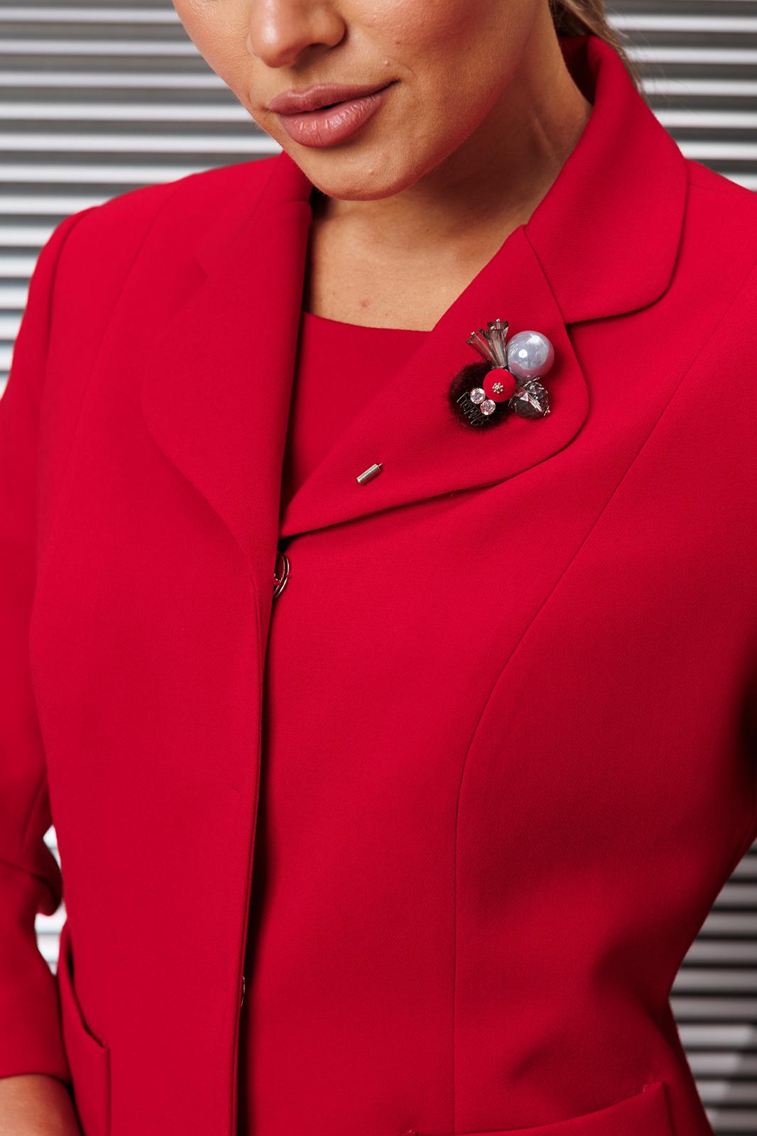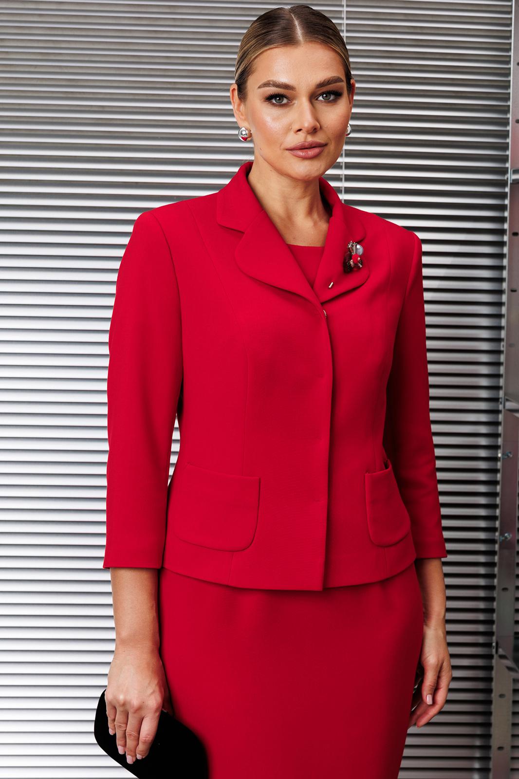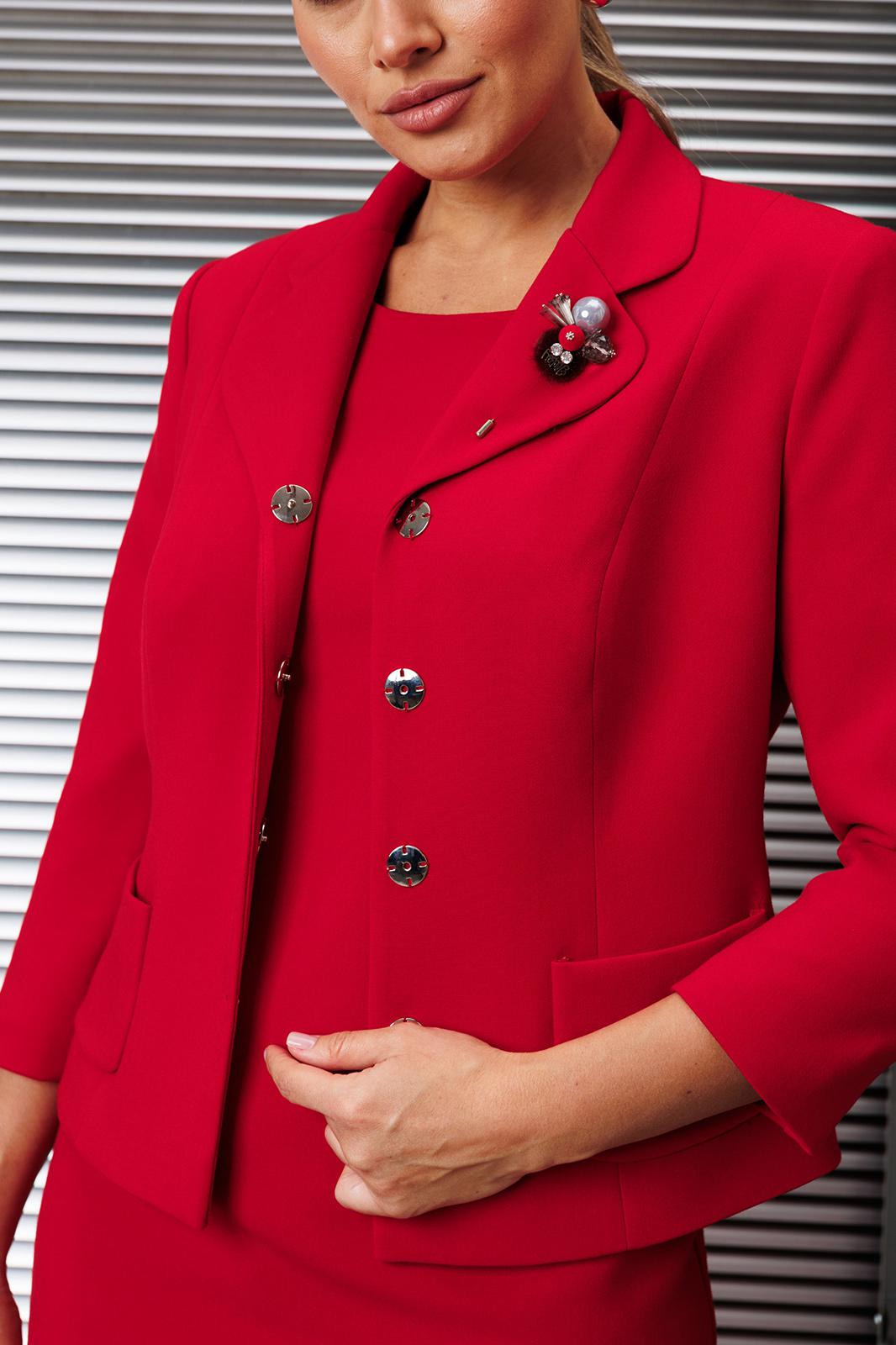 Костюм женский, состоящий из платья и жакета. Платье прилегающего силуэта. Спереди с рельефами, переходящими в вытачки. Спинка со средним швом, переходящим в шлицу. Рукав одношовный втачной. Горловина платья обработана подкройной обтачкой. Жакет прилегающего силуэта. По переду жакета рельефы, выходящие из проймы, и накладные карманы. Спинка со средним швом и рельефами. Застежка на декоративные кнопки.