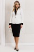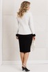 Один из самых элегантных образов в арсенале бренда. Жакет выполнен из фактурного полотна в сочетании с однотоном. Декором и главным акцентом данного комплекта является съемная рюша по линии горловины и низу рукава. Жакет полуприлегающего силуэта с рельефами по переду и спинке. Рукав втачной, двухшовный. Спинка со средним швом. Застежка центральная на петли-пуговицы. Юбка прямая, зауженная к низу, на притачном поясе, по бокам с резинками. Застежка на тесьму-молнию в среднем шве, который переходит в шлицу. Костюм на подкладке.