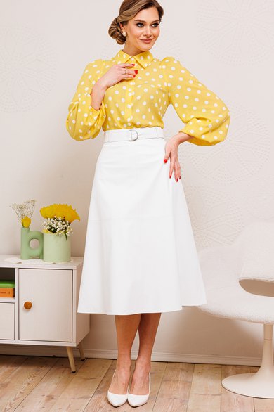 Комплект состоит из юбки и блузы. Блуза из штапеля, для повседневной носки, прямого силуэта, с центральной застежкой на петли-пуговицы. Полочки с нагрудными вытачками, в боковых швах – разрезы. Спинка цельная. Рукава втачные, рубашечного покроя, со сборкой по окату. По низу рукава резинка. Воротник втачной, отложной. Юбка расширенного силуэта, четырехклинка. Благодаря универсальности и практичности фасона юбка-четырехклинка уже давно является классической моделью. Она идет большинству женщин различных возрастов и типов фигур. Такой фасон способен подчеркнуть достоинства и скрыть недостатки внешности ее хозяйки. Самый хитовый вариант – это кожаная или джинсовая юбка с карманами и притачным поясом. Наша юбка выполнена из эко-кожи на х/б подкладке. К юбке прилагается отделочный пояс.длина юбки: 77 см