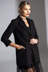 Жакет выполнен в классическом стиле с полуприлегающим силуэтом. Он удлиненный, имеет центральную застежку на одну пуговицу и элегантные детали, такие как спинка с средним швом и шлицей, а также перед с талиевыми вытачками и наклонными карманами с клапанами. Воротник пиджачного типа добавляет строгости, а втачные двухшовные рукава длиной 3/4 со шлицей в локтевом шве и пуговицей придают жакету изысканный вид.