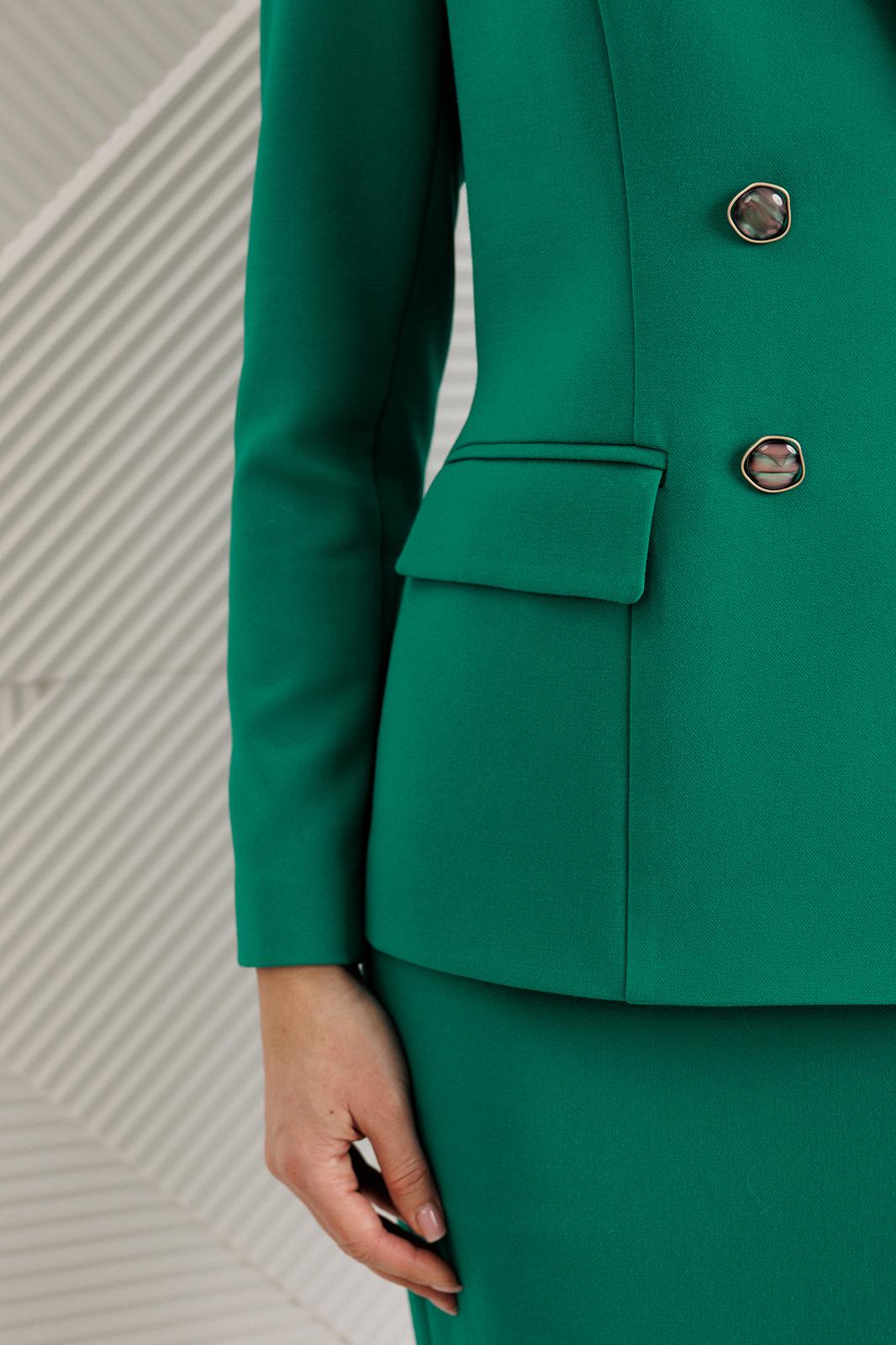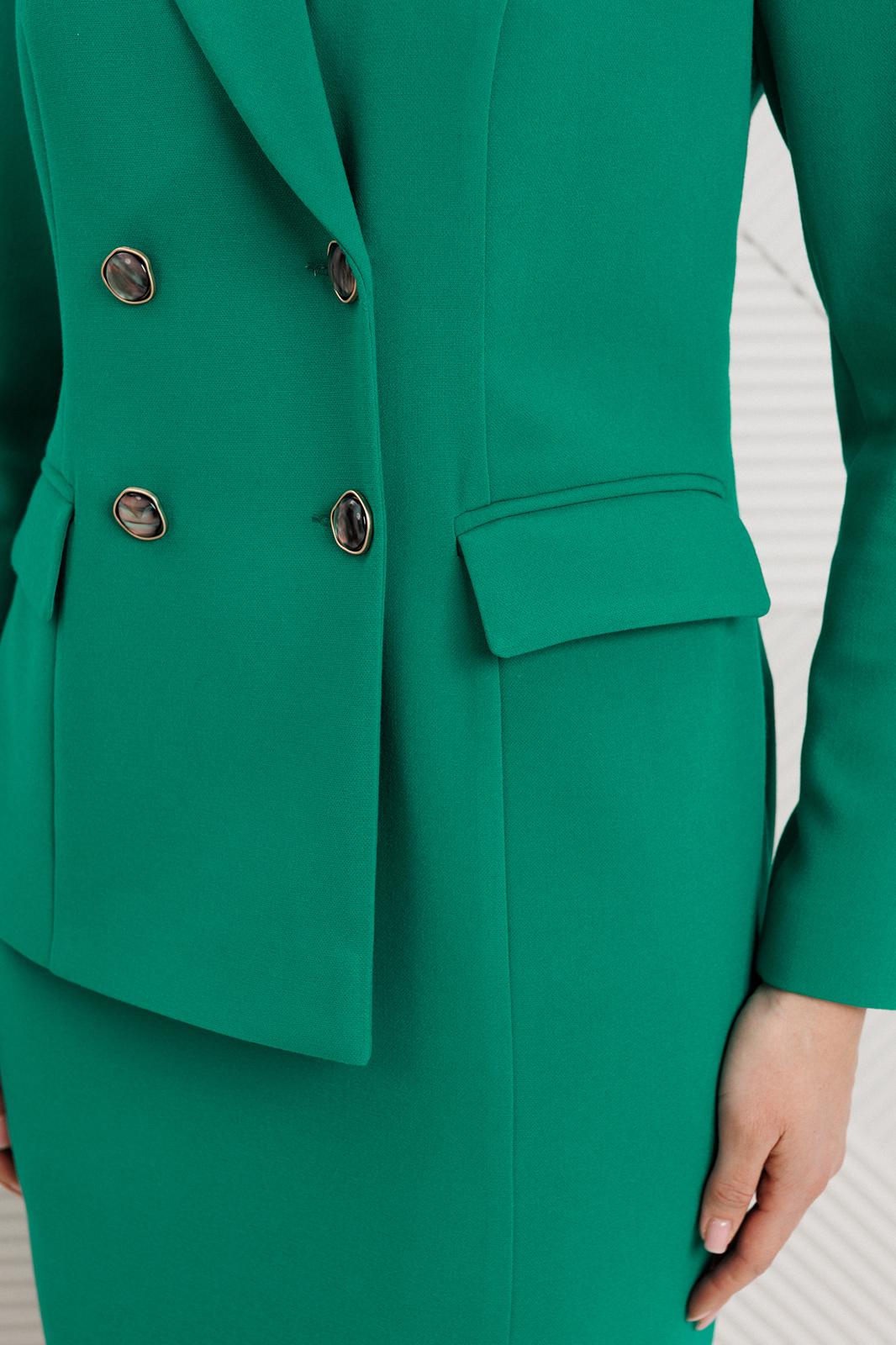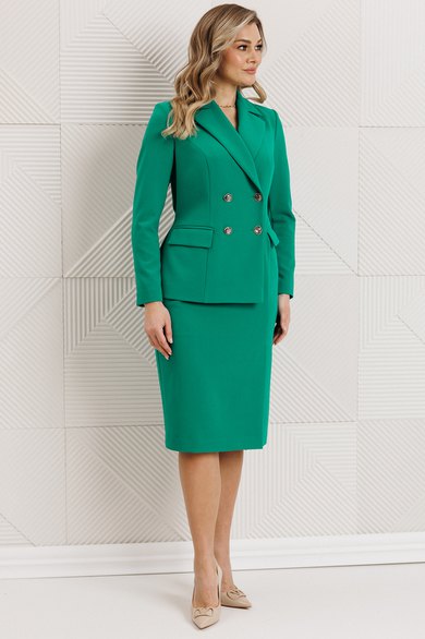 Сомневаетесь, выбрать для важной встречи строгий костюм или элегантное платье? Предлагаем блестящий компромисс! Платье-блейзер полуприлегающего силуэта, длиной ниже колена. Имитация жакета придаёт деловой стиль. Воротник пиджачного типа. Застёжка двубортная на 2 пары пуговиц, в левом боковом шве- потайная молния. На полочке присутствует рельеф из проймы до низа,в котором обработана шлица, обработаны карманы «в рамку с клапаном». Спинка со средним швом и талевыми вытачками. Рукава длинные, двушовные. Платье частично на подкладке. Вы получаете весь эффект от сложного ансамбля, минуя лишние сложности. Платье подчеркивает Ваш статус и деловой настрой.
