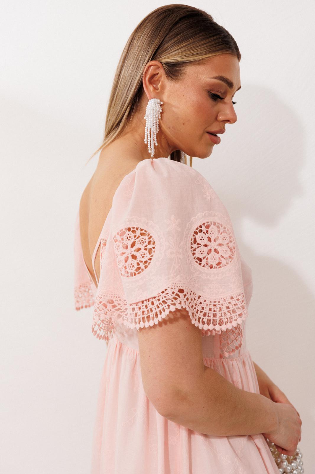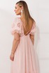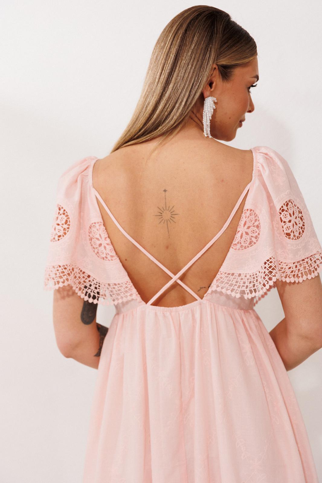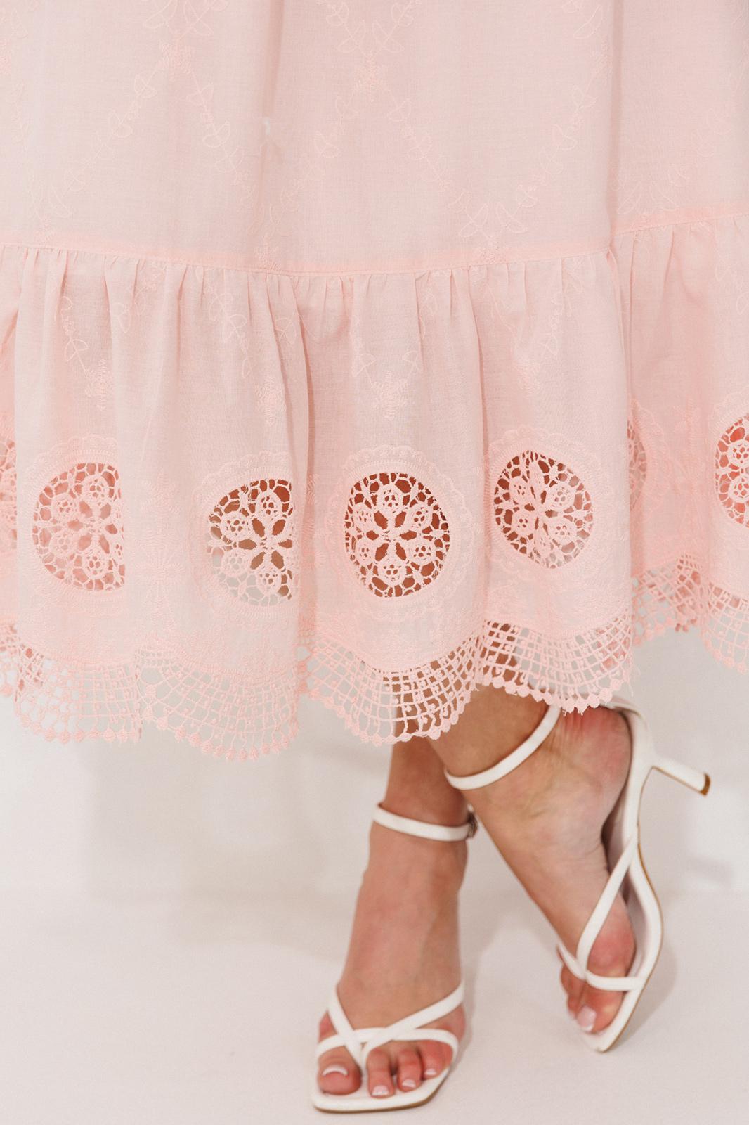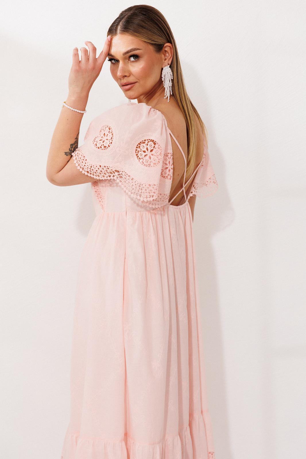 Лиф с глубоким V-образным вырезом мягко очерчивает силуэт, а открытая спинка, которую удерживают лишь две тонкие бретели, дарит ощущение прохлады и беззащитной красоты. От линии талии начинается свободная юбка, лежащая мягкими фалдами благодаря воздушной сборке. Она уходит в пол удлиненным силуэтом, а внизу её украшает притачная оборка, расшитая ажурным шитьём.