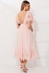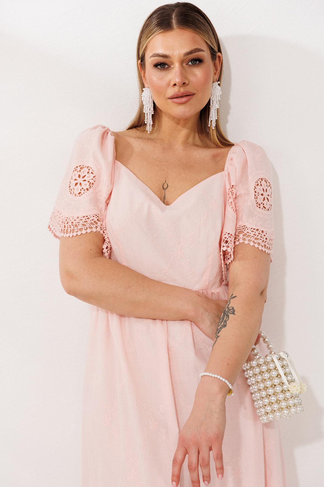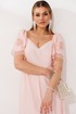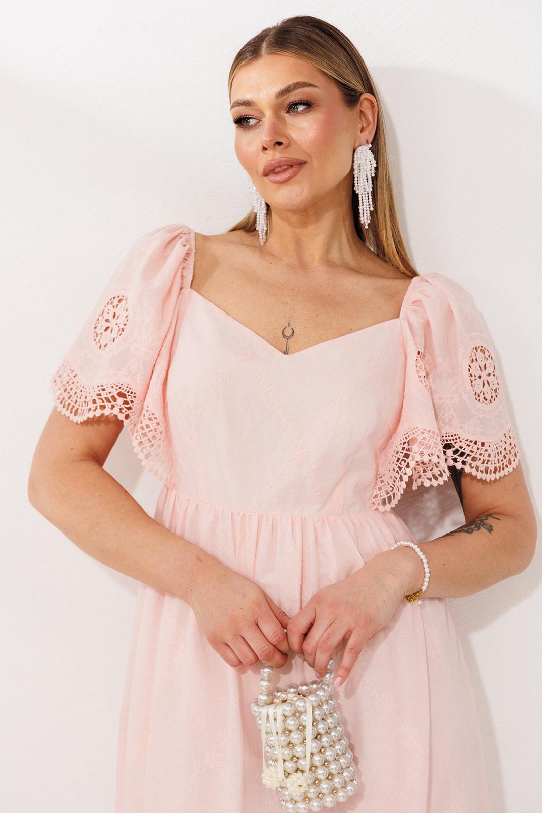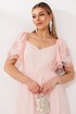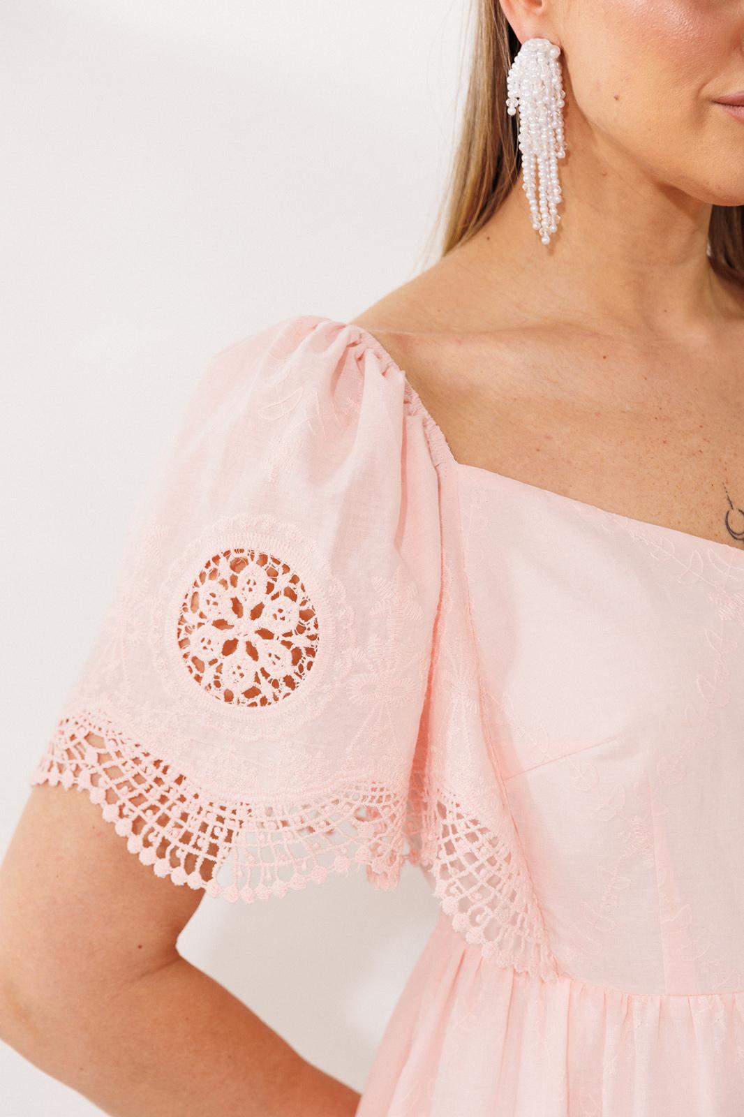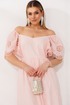 В этом платье читается нежность. Оно сшито из дышащей хлопковой ткани. Воздушные рукава, присборенные по окату эластичной резиной, можно носить классически или спустить вниз, открывая линию плеч - это добавляет образу то трогательную застенчивость, то расслабленную романтику.