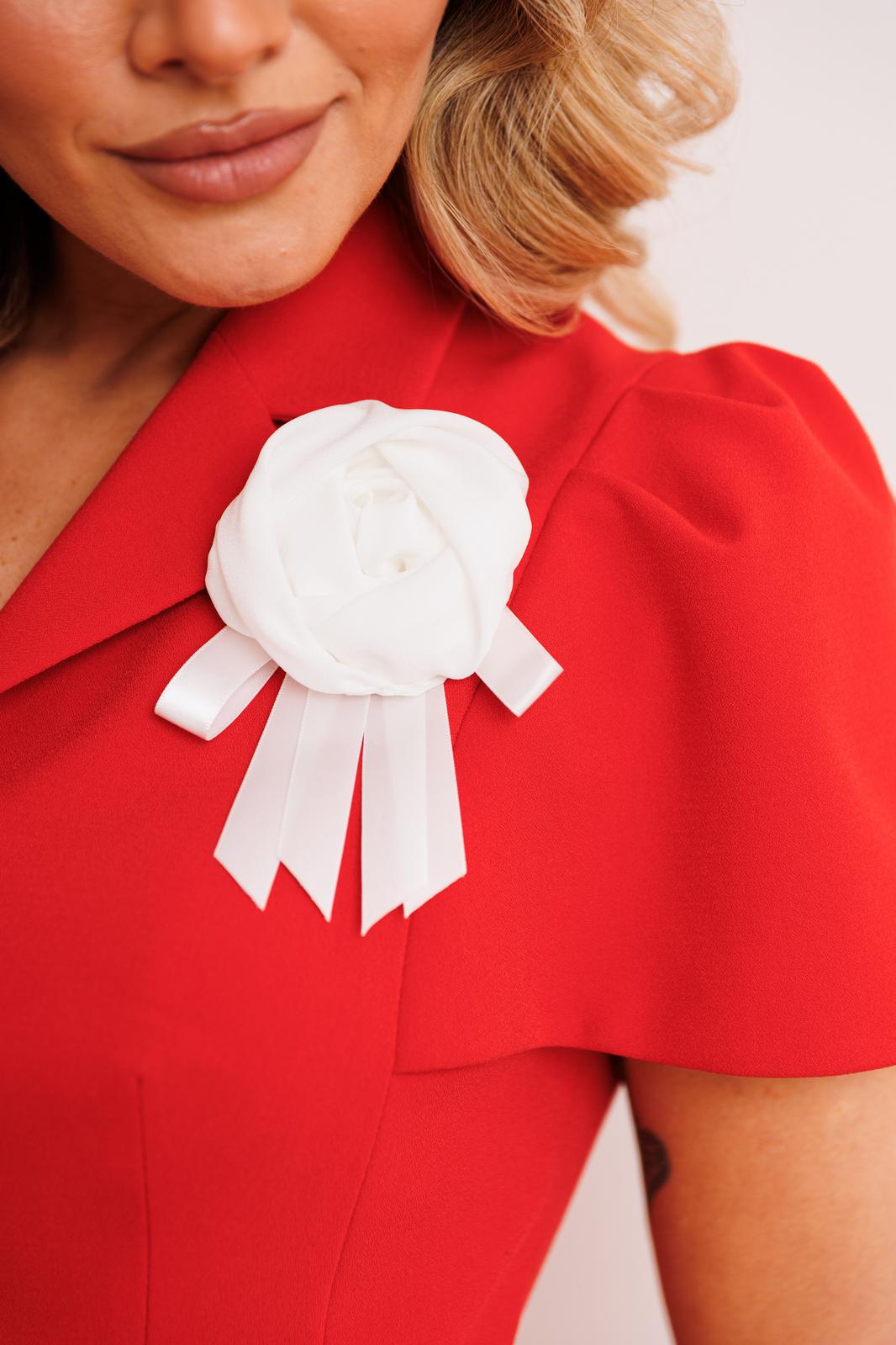 Двухпредметный комплект, состоящий из жакета и юбки. Жакет полуприлегающего силуэта, отрезной по линии талии. Перед и спинка с вертикальными рельефами, в которые вставлены рукава, сверху по окату со складками. Спинка со средним швом. Воротник пиджачного типа. Застежка на петли-пуговицы. Юбка А-силуэта, на притачном поясе, по бокам с резинками. Застежка на тесьму-молнию в среднем шве, который переходит в шлицу. Костюм на подкладке. Комплект декорирован съемной брошью в виде цветка.