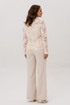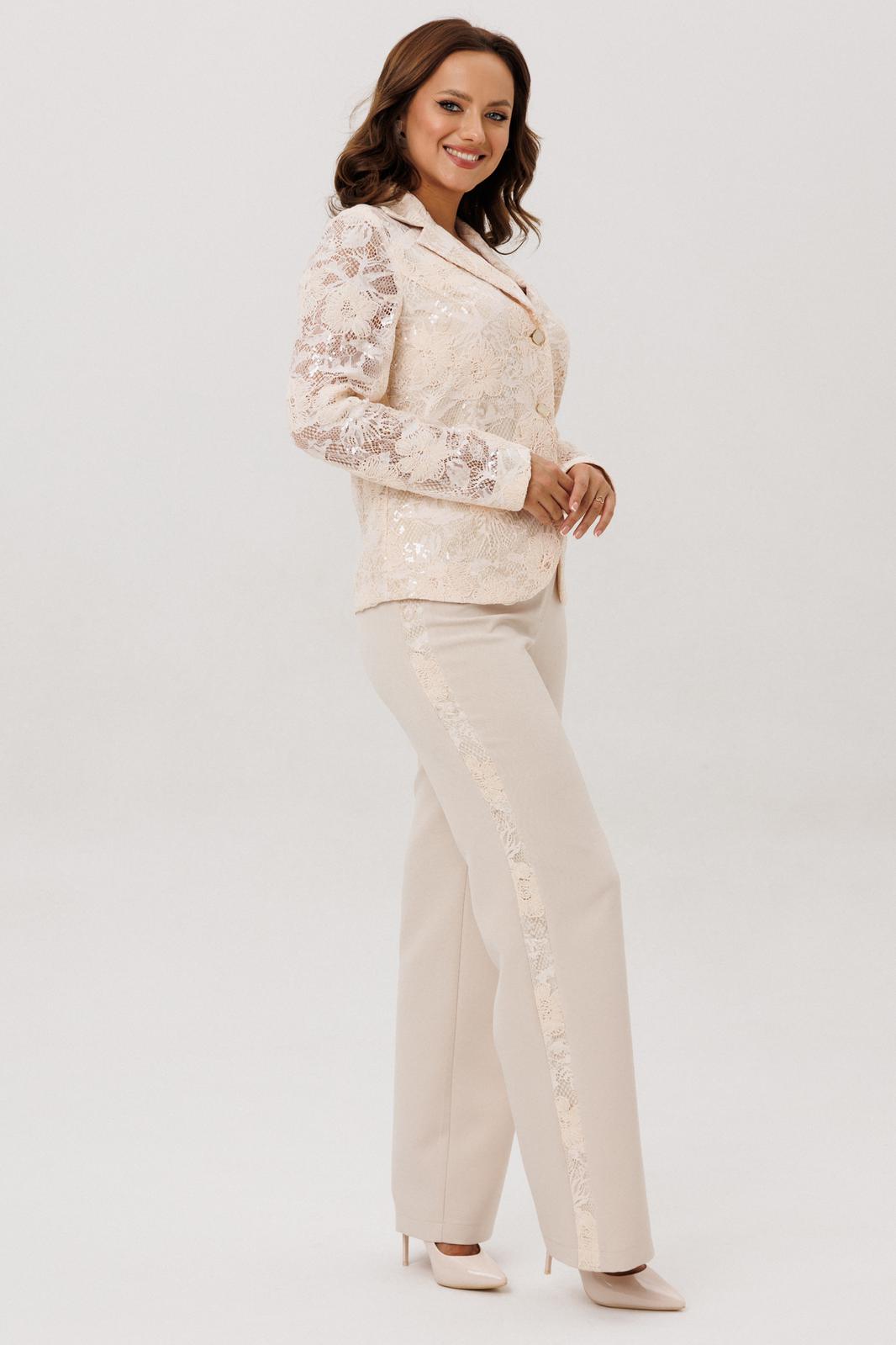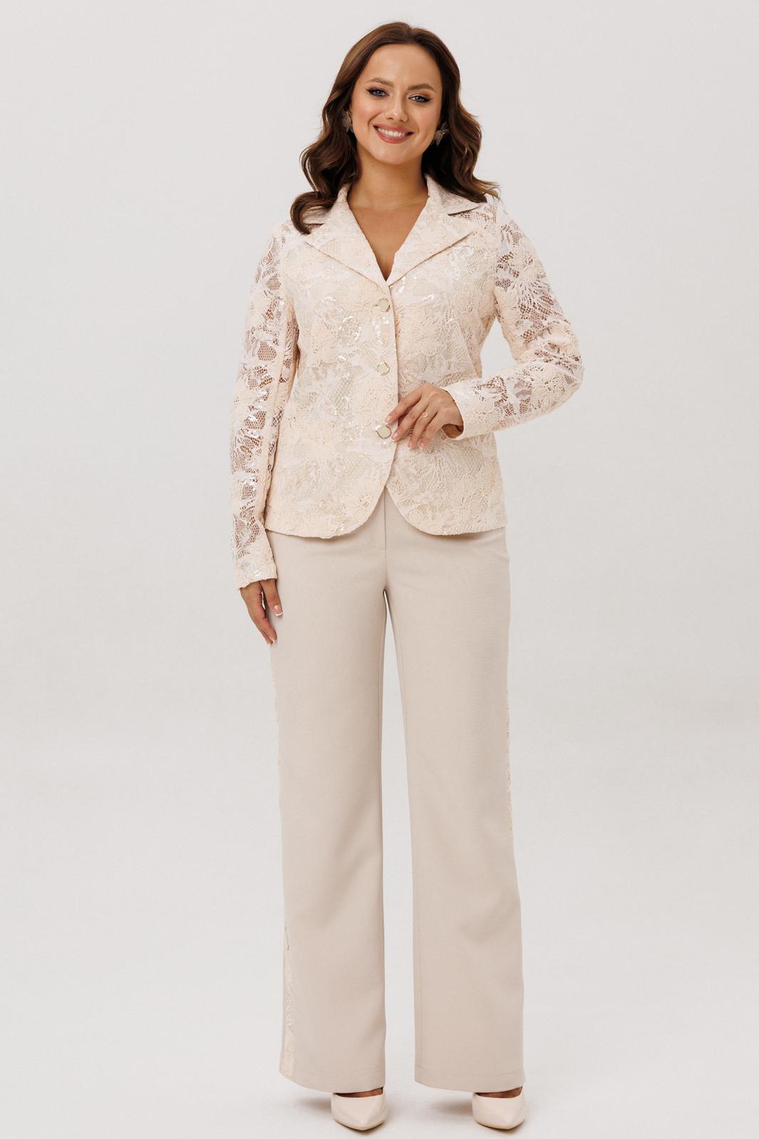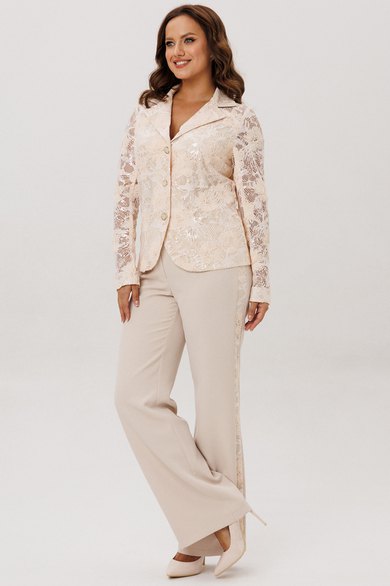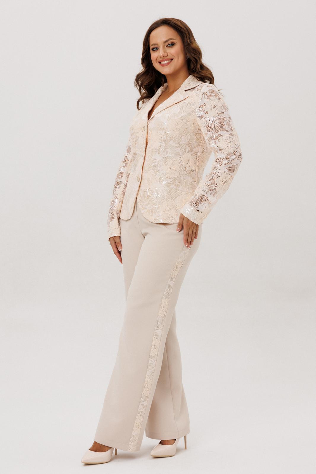 Нарядный женский костюм, состоящий из жакета и брюк, выполненный из костюмной ткани (тянется) и из гипюра с вышивкой и пайетками (не тянется).