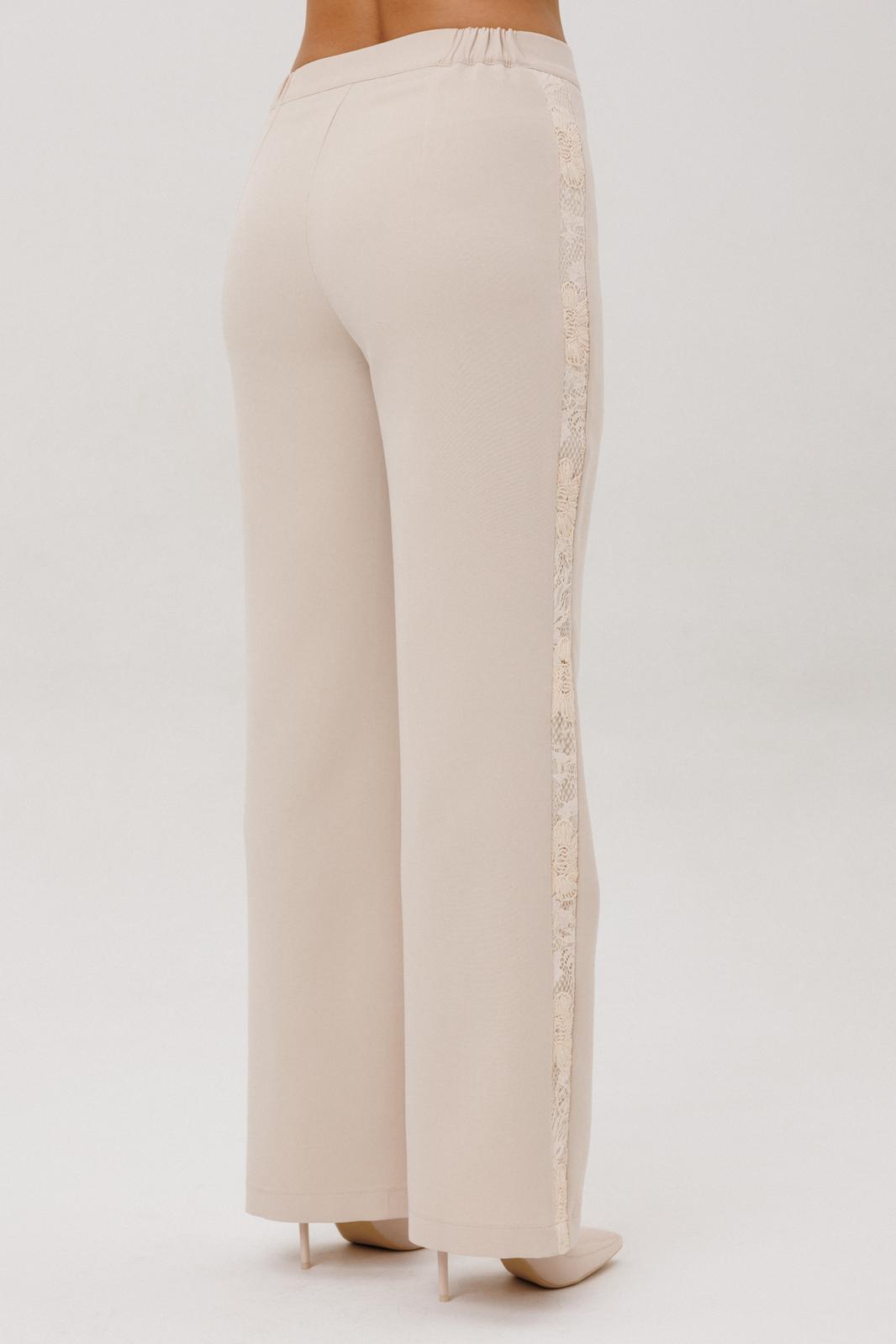 Брюки с высокой посадкой, немного с расширением от колена к низу. По срезу банта – застежка-молния. По боковым швам лампасы из гипюра. Верхний срез оформлен поясом с эластичной резинкой по задней половинке.