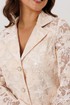 Жакет полуприлегающего силуэта, нижние части переда и спинки на подкладке, кокетка и рукава без подкладки. По переду нагрудные вытачки, центральная застежка на петли-пуговицы. По спинке талиевые вытачки. Горловина оформлена воротником пиджачного типа с лацканом. Рукава втачные двухшовные.