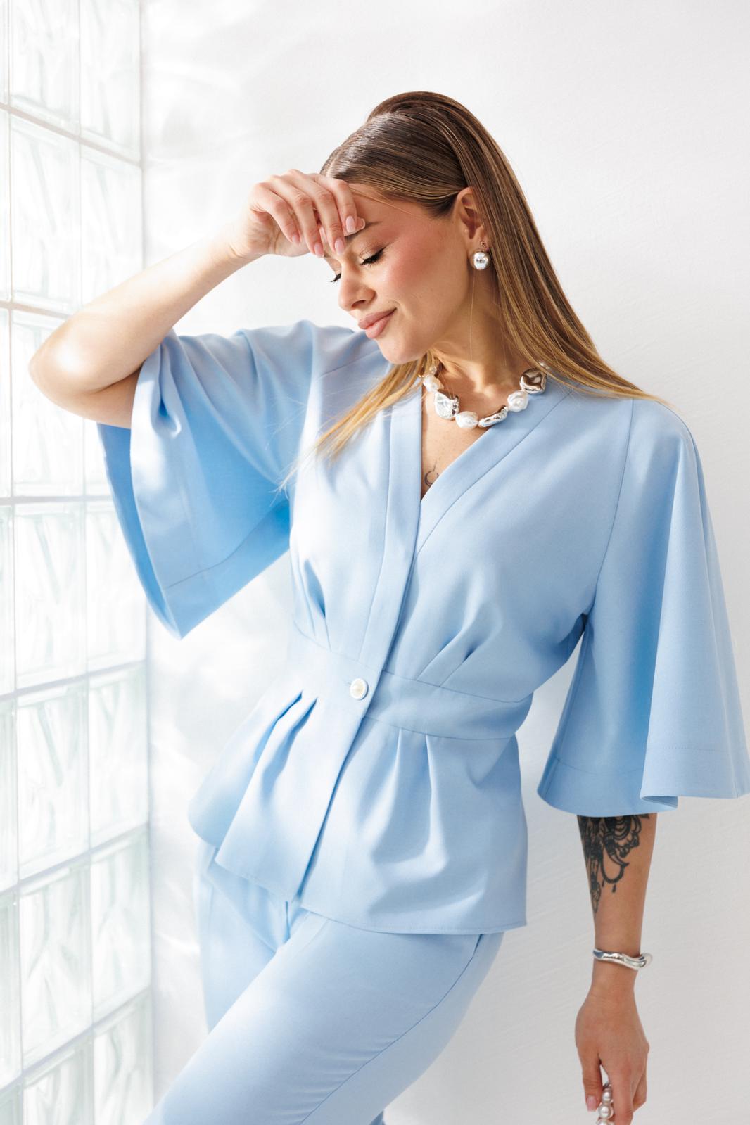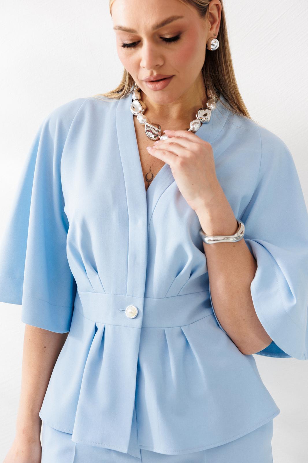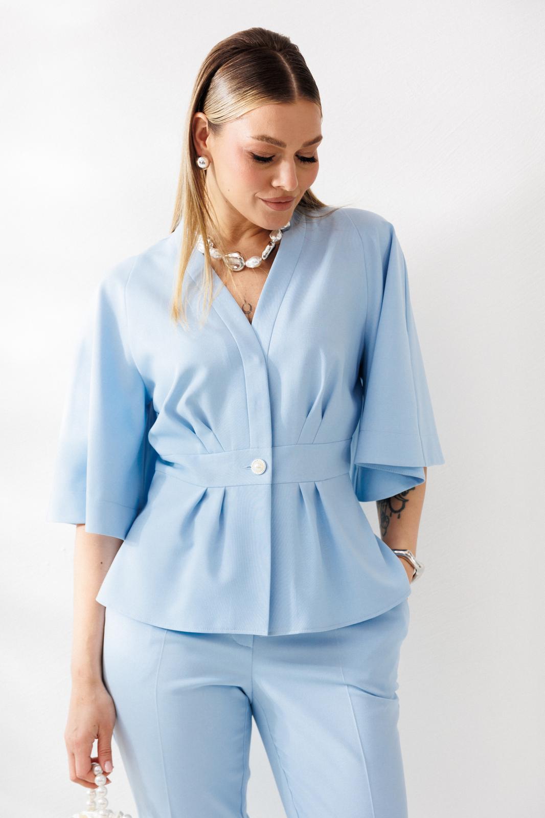 Жакет полуприлегающего силуэта с отрезным поясом и баской. По лифу переда и баскам односторонние складки. По лифу спинки талиевые вытачки. Горловина оформлена V-образным вырезом с отрезными планками. Застежка центральная на пришивные кнопки и отделочную пуговицу по поясу. Рукава покроя «реглан» расширенные к низу. Жакет без подкладки.