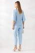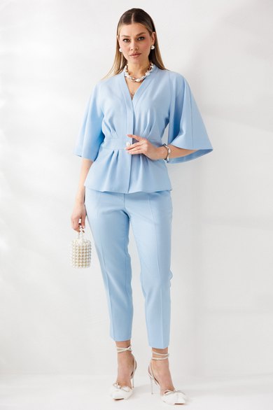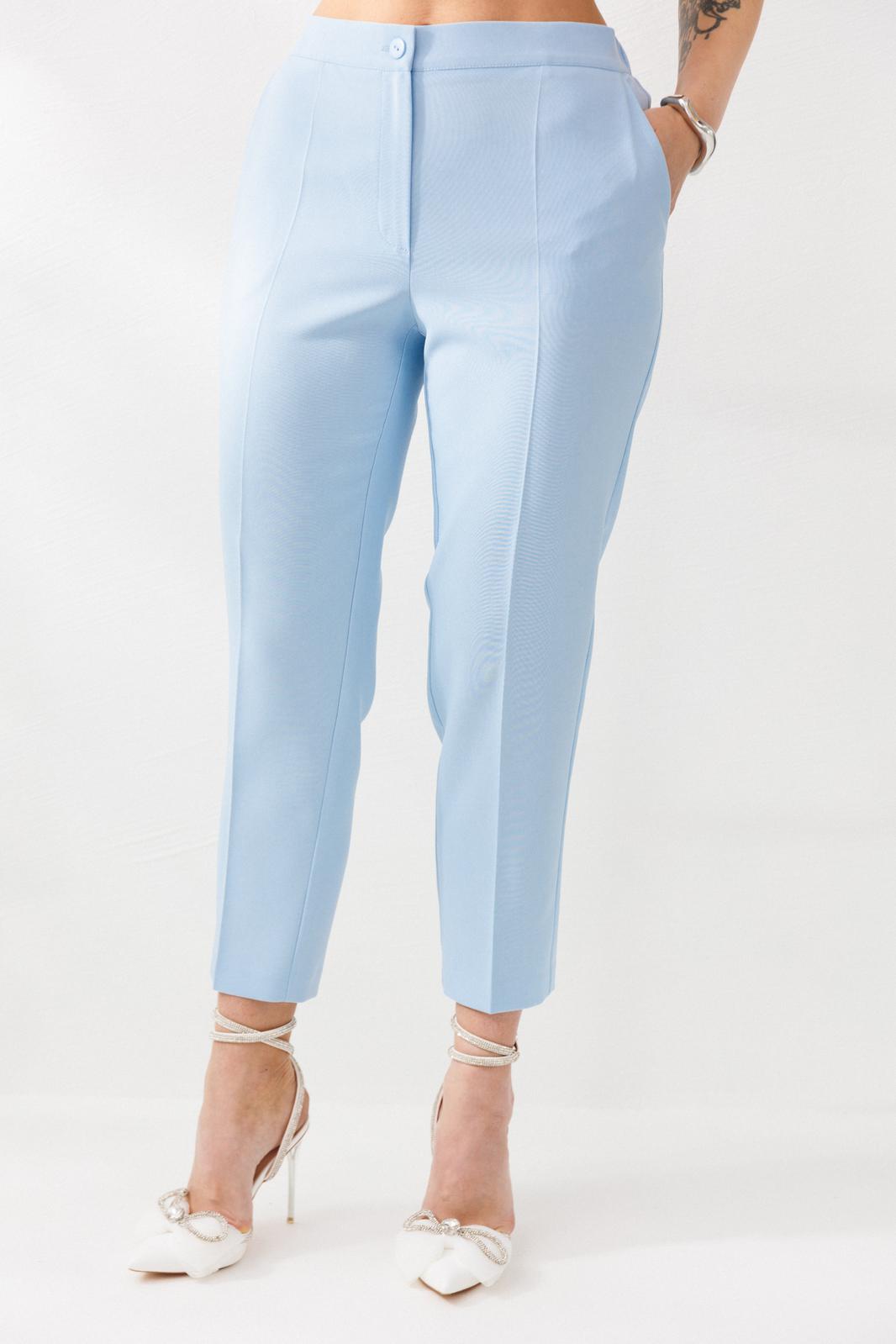 Брюки с высокой посадкой, зауженные к низу, длиной 7/8. По срезу банта – застежка-молния. В боковых швах наклонные карманы. Верхний срез оформлен поясом с резинкой по задней половинке.
