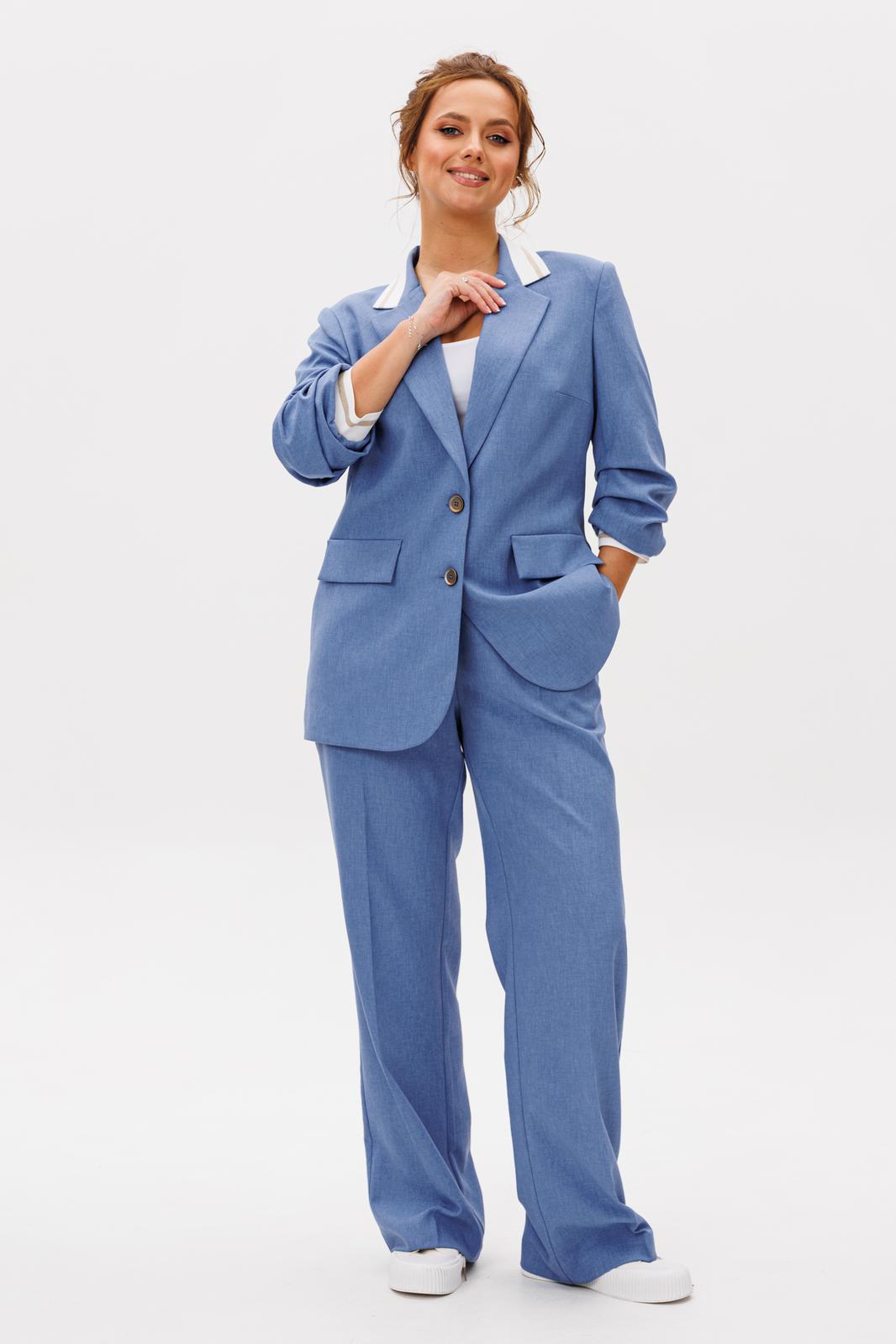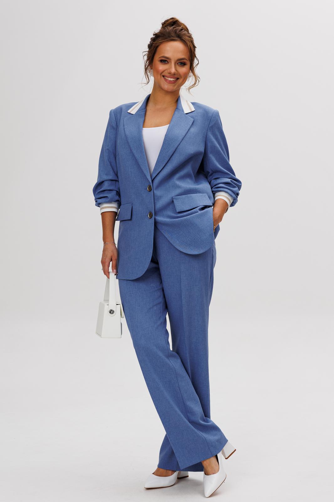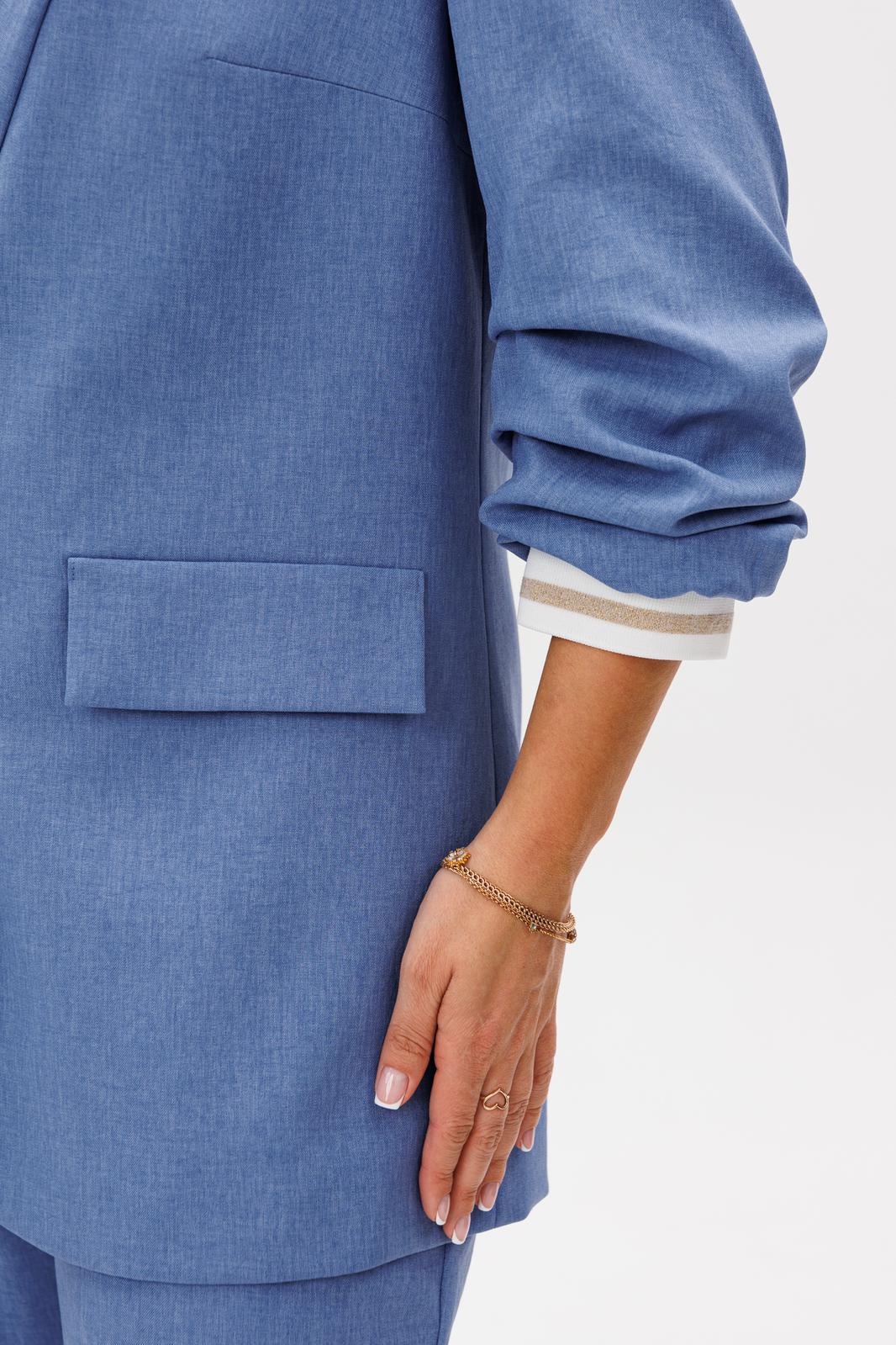 Жакет полуприлегающего силуэта, выполнен из костюмной ткани (не тянется) с отделкой из довяза на подкладке. Перед с нагрудными вытачками и настрочными клапанами. Застежка центральная на петли-пуговицы. Горловина оформлена воротником пиджачного типа с лацканом.