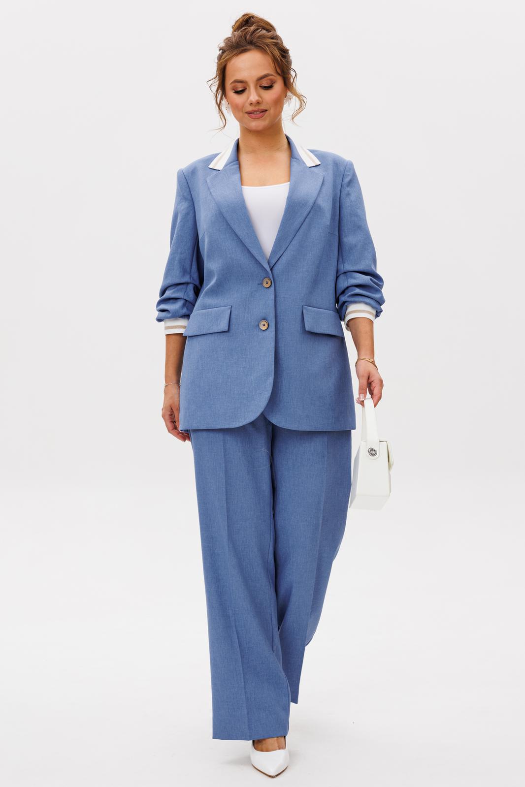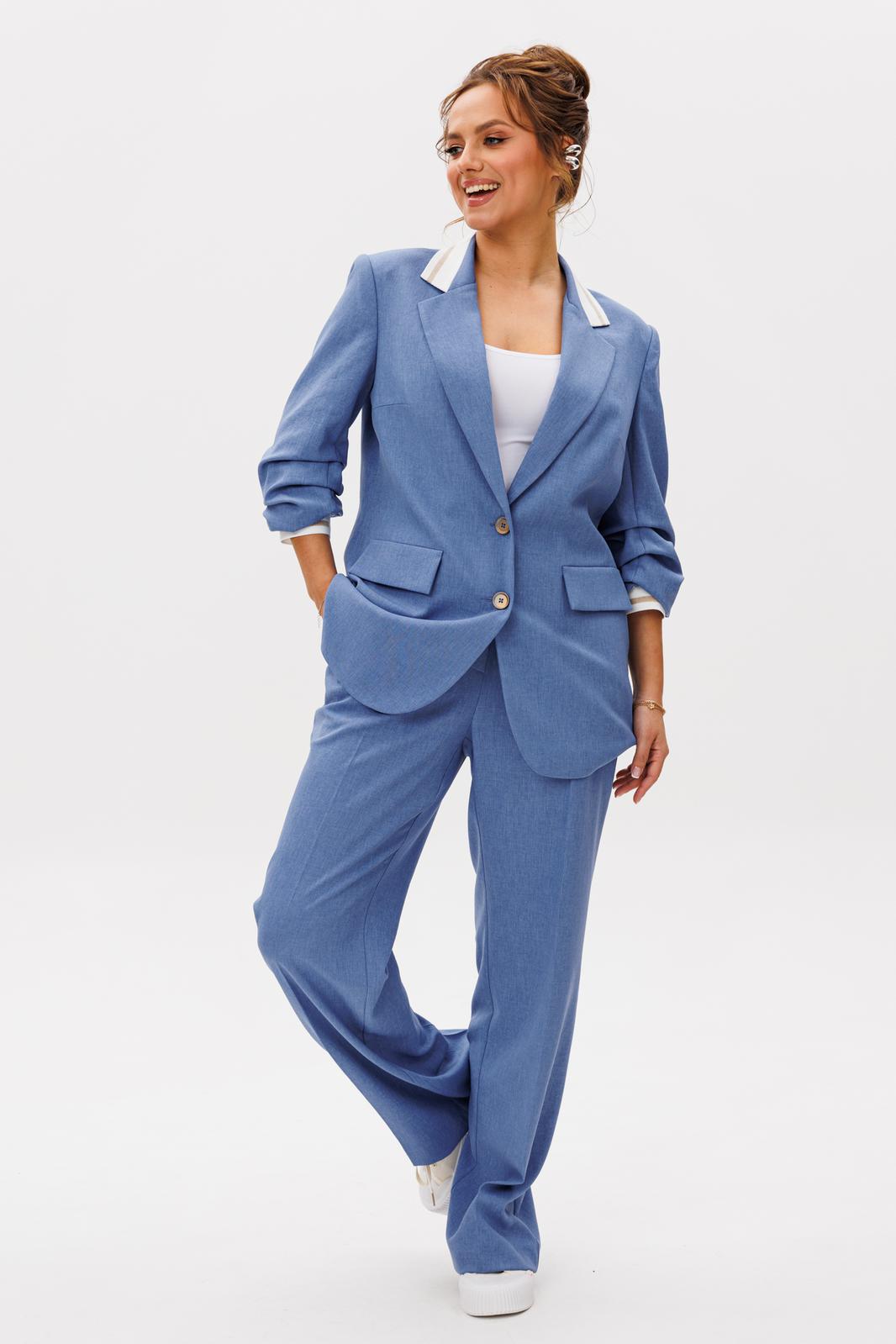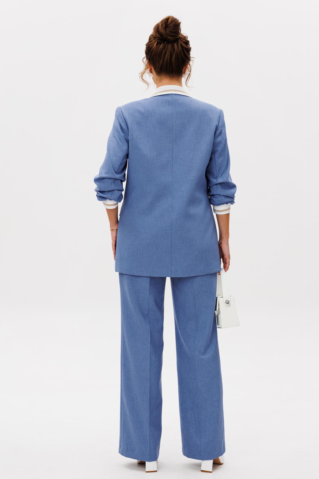 Жакет полуприлегающего силуэта, выполнен из костюмной ткани (не тянется) с отделкой из довяза на подкладке. Перед с нагрудными вытачками и настрочными клапанами. Застежка центральная на петли-пуговицы. Горловина оформлена воротником пиджачного типа с лацканом.