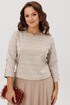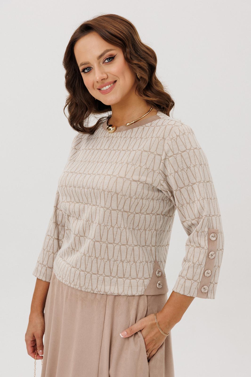 Джемпер полуприлегающего силуэта, выполнен из мягкого трикотажного полотна (тянется) с отделкой из замши. Перед цельный. Спинка со средним швом. Горловина-лодочка оформлена притачной планкой из отделочной ткани. По боковым швам, внизу – отрезные детали треугольной формы из отделочной ткани с декоративными пуговицами. Рукава втачные со швом по середине и планкой из отделочной ткани с декоративными пуговицами.