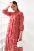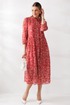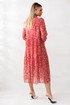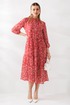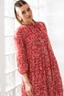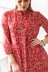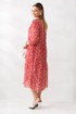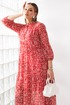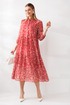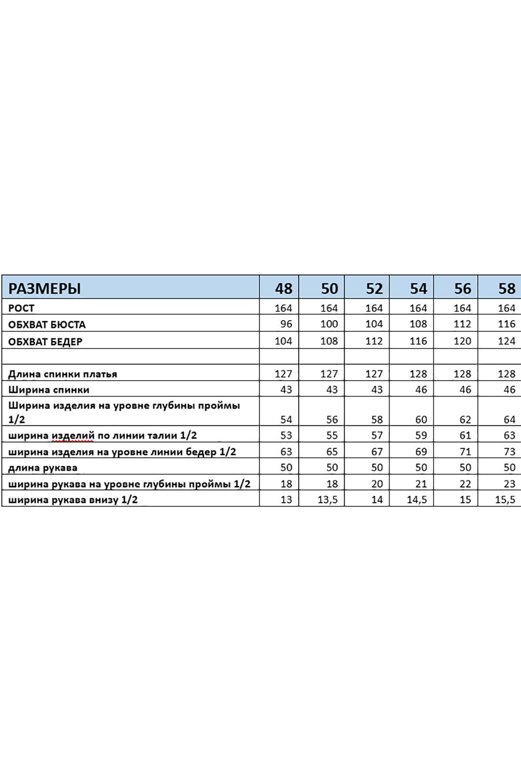 Платье отрезное чуть выше линии талии. Верхняя часть переда с V-образным вырезом и цельнокроеными планками. Горловина оформлена рюшей, присборенной резинкой. Горловина с завязками. По нижней части платья два ряда присборенных воланов. Рукава втачные, одношовные по низу присборены резинкой.