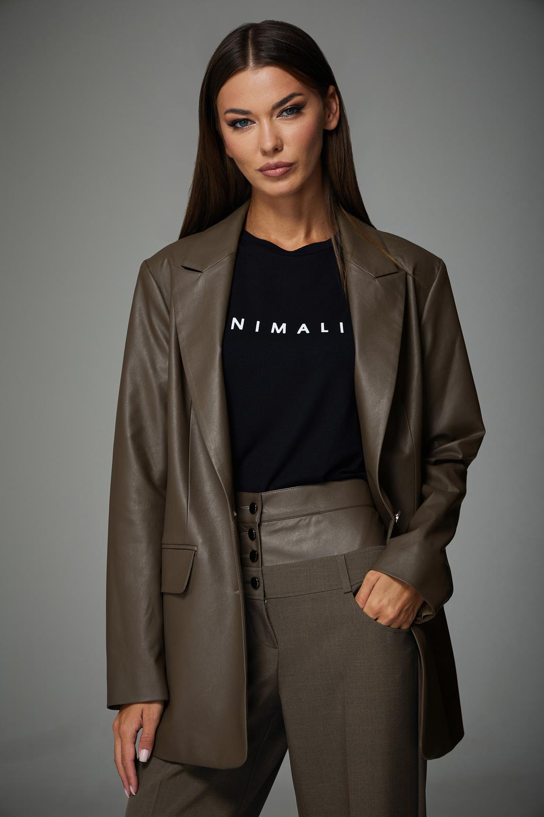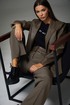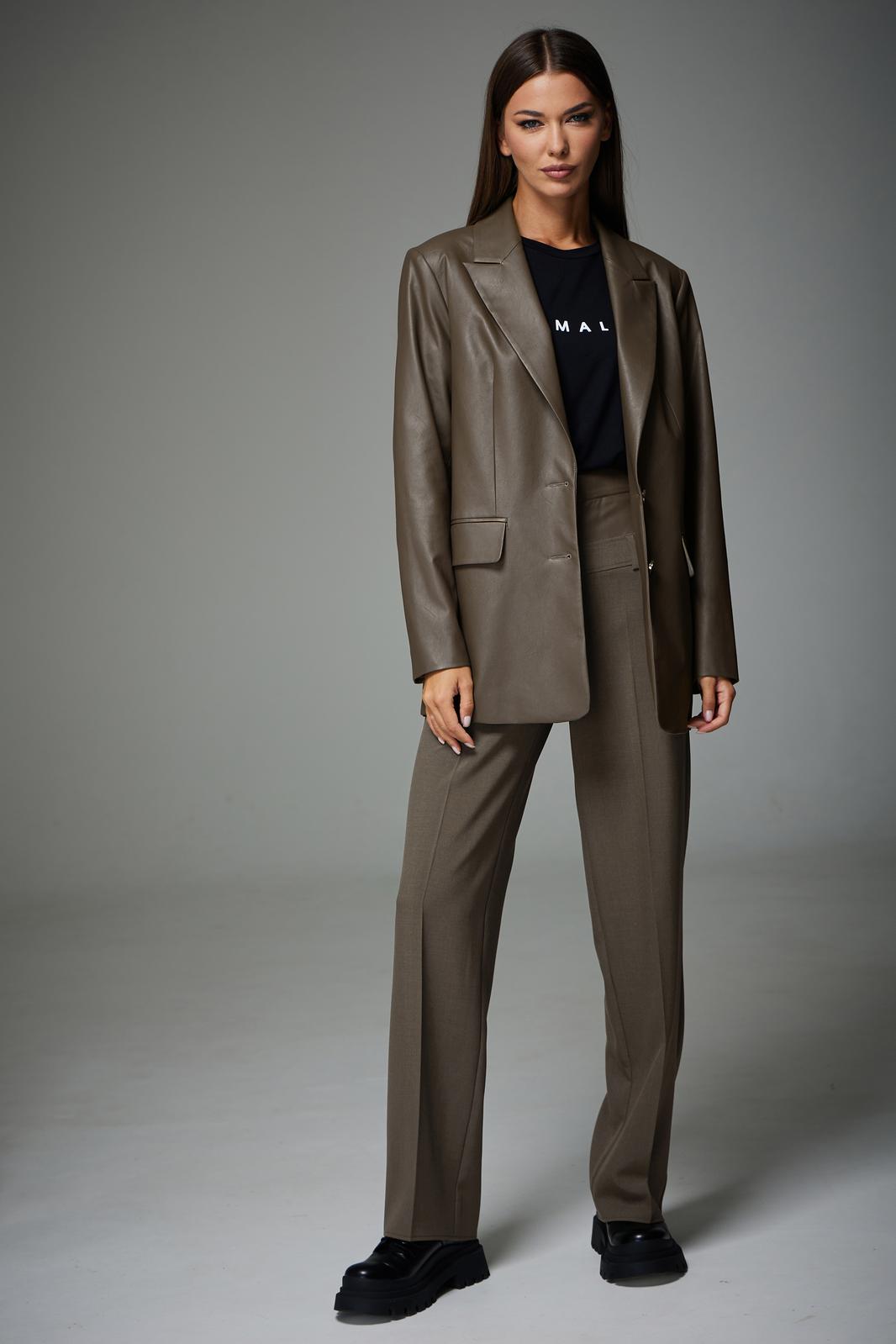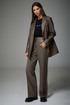 Комплект, состоящий из жакета и брюк, втачного покроя, свободного силуэта. Выполнен из двух видов ткани.