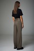 Брюки комбинированные из двух видов тканей, прямой формы, в области талии и бедер облегающие. В брюках заутюжены стрелки. Кокетка передней и задней половинки выполнены в тон основной ткани, пояс выполнен из экокожи. На передних половинках выполнены застежка на петли и пуговицы на гульфик. Нижний пояс в брюках выполнен из основной ткани, на поясе расположены шлевки. В боковых швах расположены карманы закругленной формы.