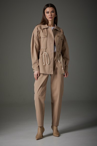 Жакет покроя спущенное плечо. Рукав двухшовный, с манжетой по низу, на две петли-пуговицы, по низу рукава расположены вытачки, создающие объемную форму. В шов притачивания рукава и кокетки по спинке вставлена бахрома из основной ткани. Горловина округлой формы, оформлена воротником стойкой покроенным по косой. По низу спинки и переда застрочены вытачки, что создает форму бочонка. По переду расположены наклонные прорезные карманы листочка и притачные клапаны, покроенные по косой. Дополнением жакета служат пуговицы в цвет золота.