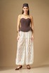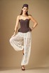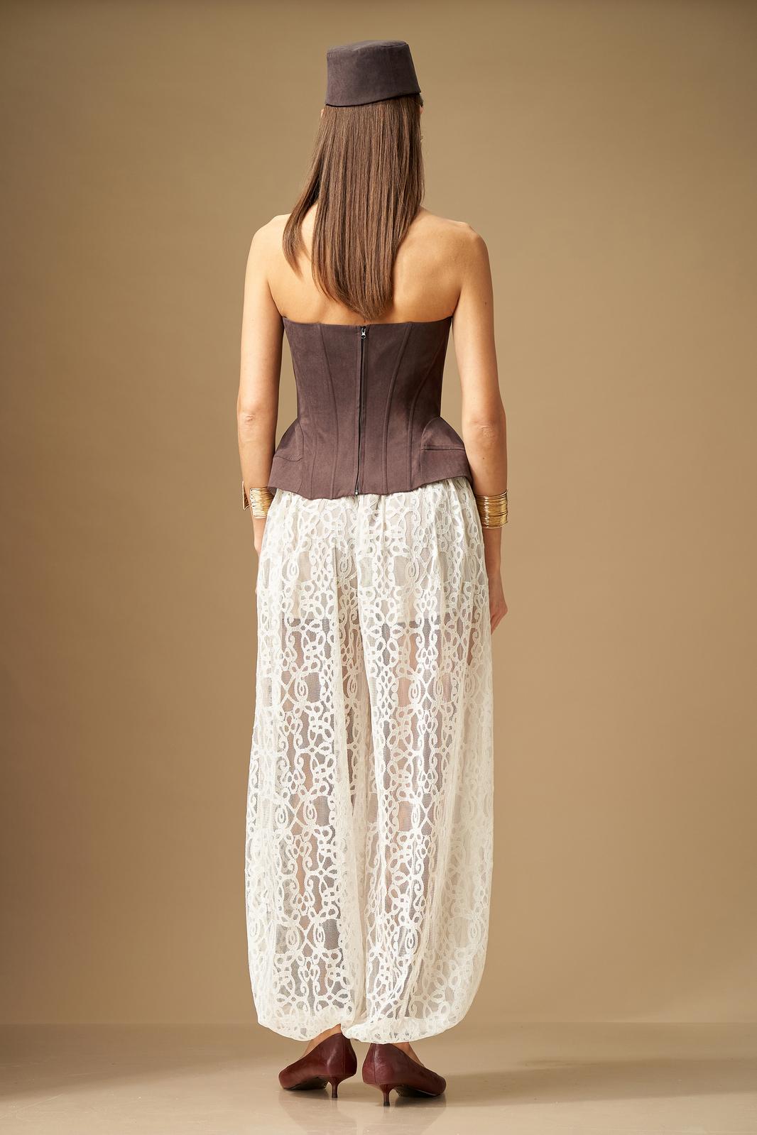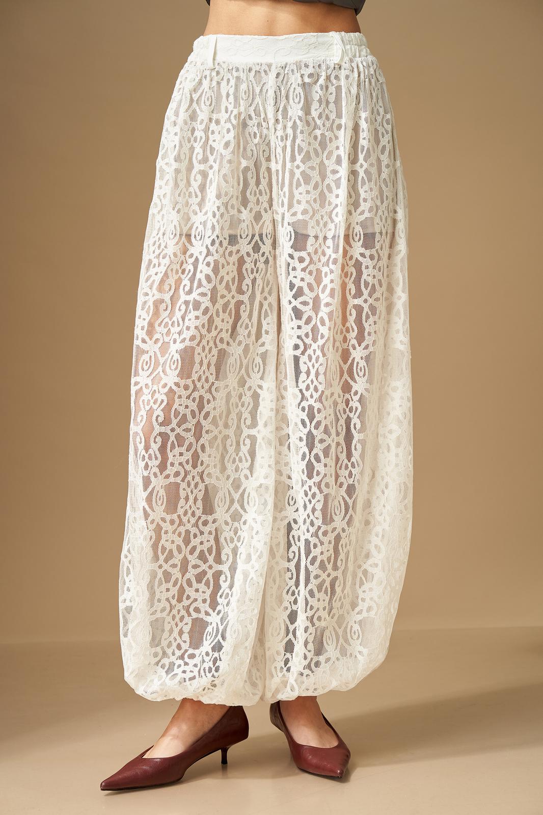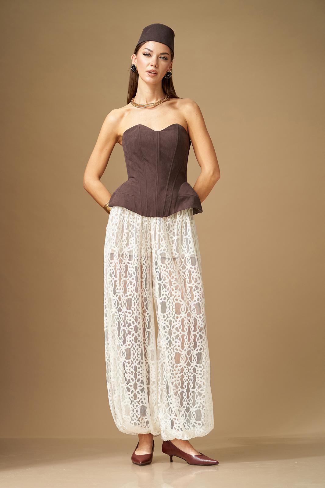 Брюки свободной формы, с низкой посадкой, сильно расширенные и собранные снизу на резинку, выполнены из кружевного полотна. Верхний срез обработан поясом на резинке, центр переда без резинки, пояс со шлевками. В пояс притачены короткие шорты из трикотажного полотна. Брюки по силуэтной форме – Алладины.