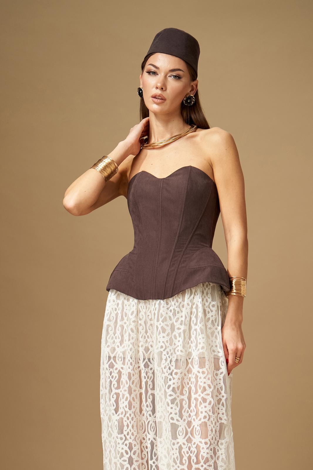 Корсет плотно-прилегающего силуэта, с отрезными расширенными вставками-бочками, идущими от талии вниз. По переду и спинке, по всем рельефным линиям вставлены косточки (отделочные строчки по 7мм). На спинке по среднему шву вставлена разъемная молния. По переду фигурный вырез. Корсет на подкладке.