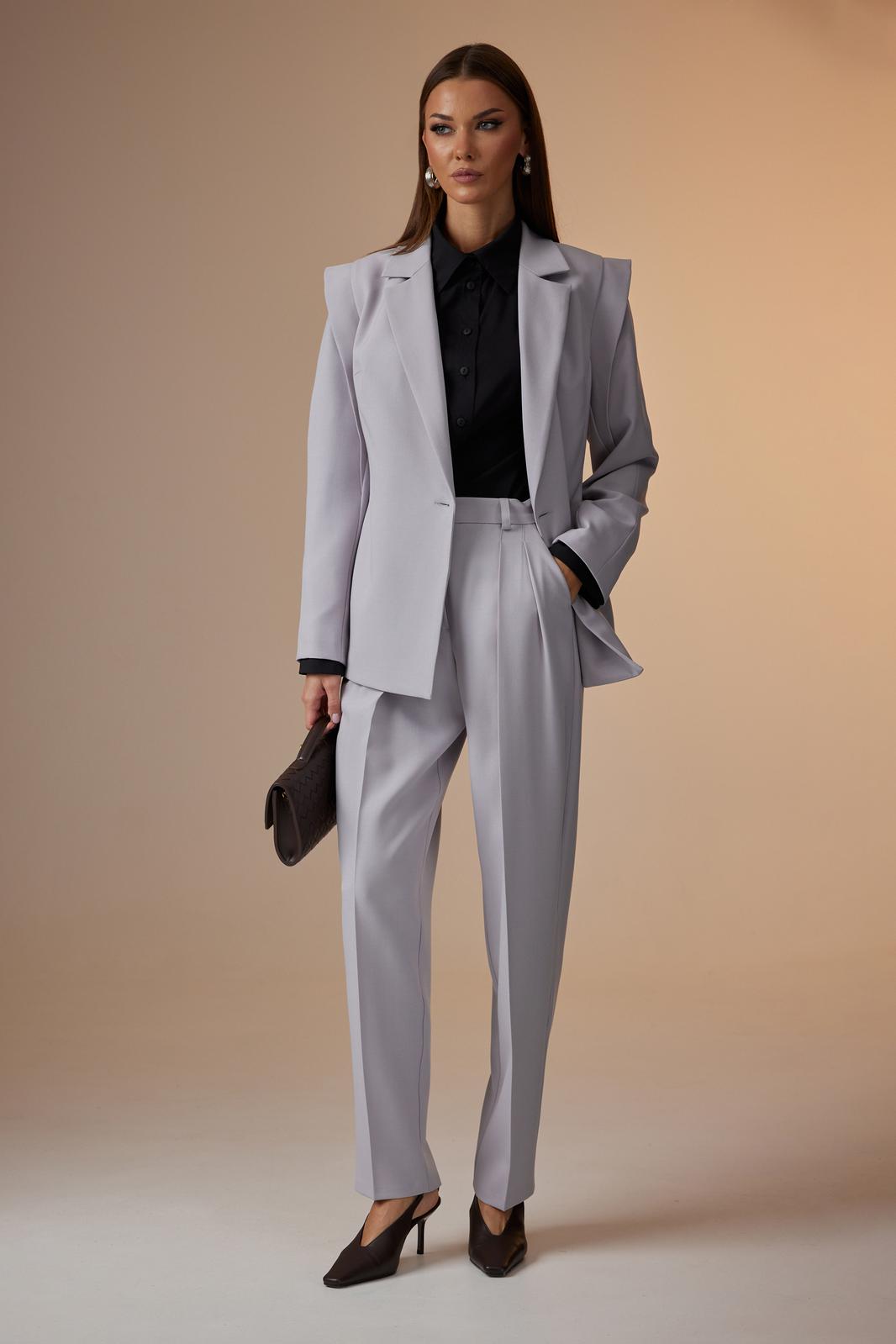 - Тип ткани: Жакет, брюки – полиэстер 55%, вискоза 42%, спандекс 3%; Блуза – хлопок 96%, эластан 4%