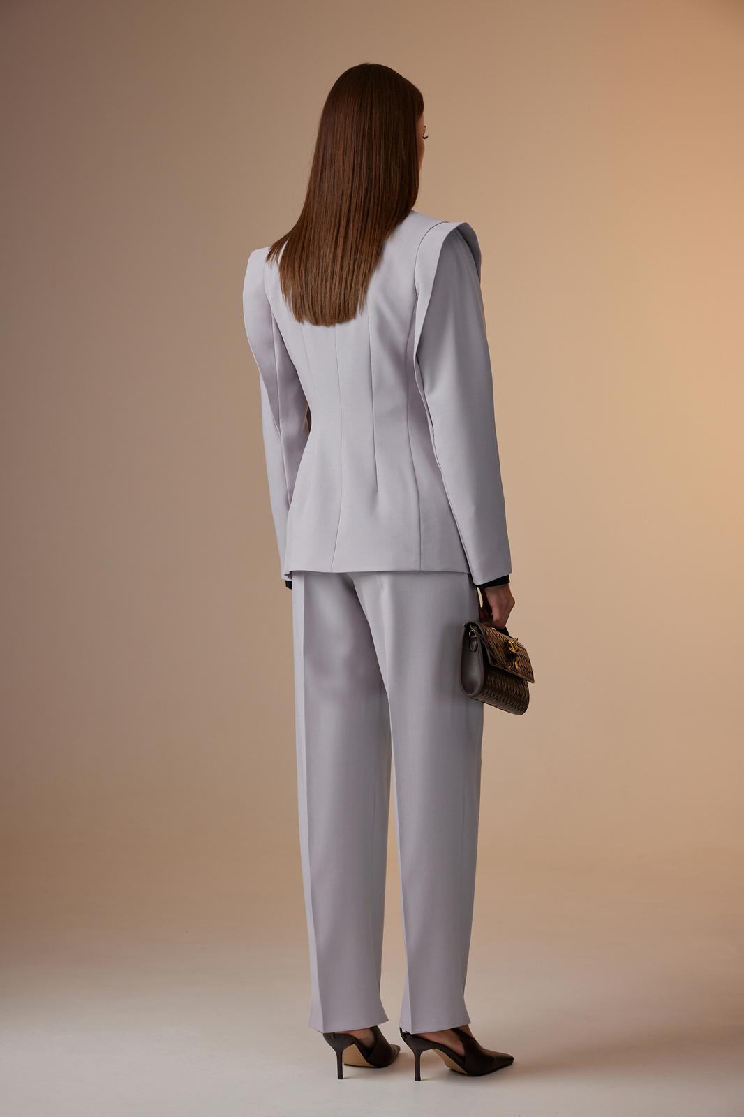 Жакет: полуприлегающего силуэта с двухбортной застежкой на одну пуговицу. Воротник пиджачного типа. Рукав длинный, трехшовный – дополнительный шов по центру верхней половинки для создания объема рукава, так же в швы верхних половин рукава вставлено крылышко для расширения линии плеча. По переду отрезной бочок, от него нагрудная вытачка и карманы в шве. Спинка со средним швом, отрезным бочком и талиевыми вытачками.
