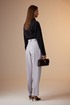 Брюки: типа «бананы». На передних и задних половинках заутюжены стрелки. На передней половинке боковой карман и две складки, направленные к центру. На задней правой половинке выполнен прорезной карман с листочкой. Верхний срез брюк обработан поясом со шлевками.