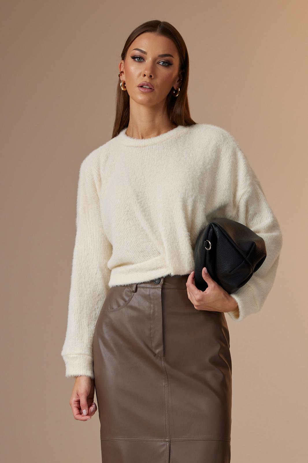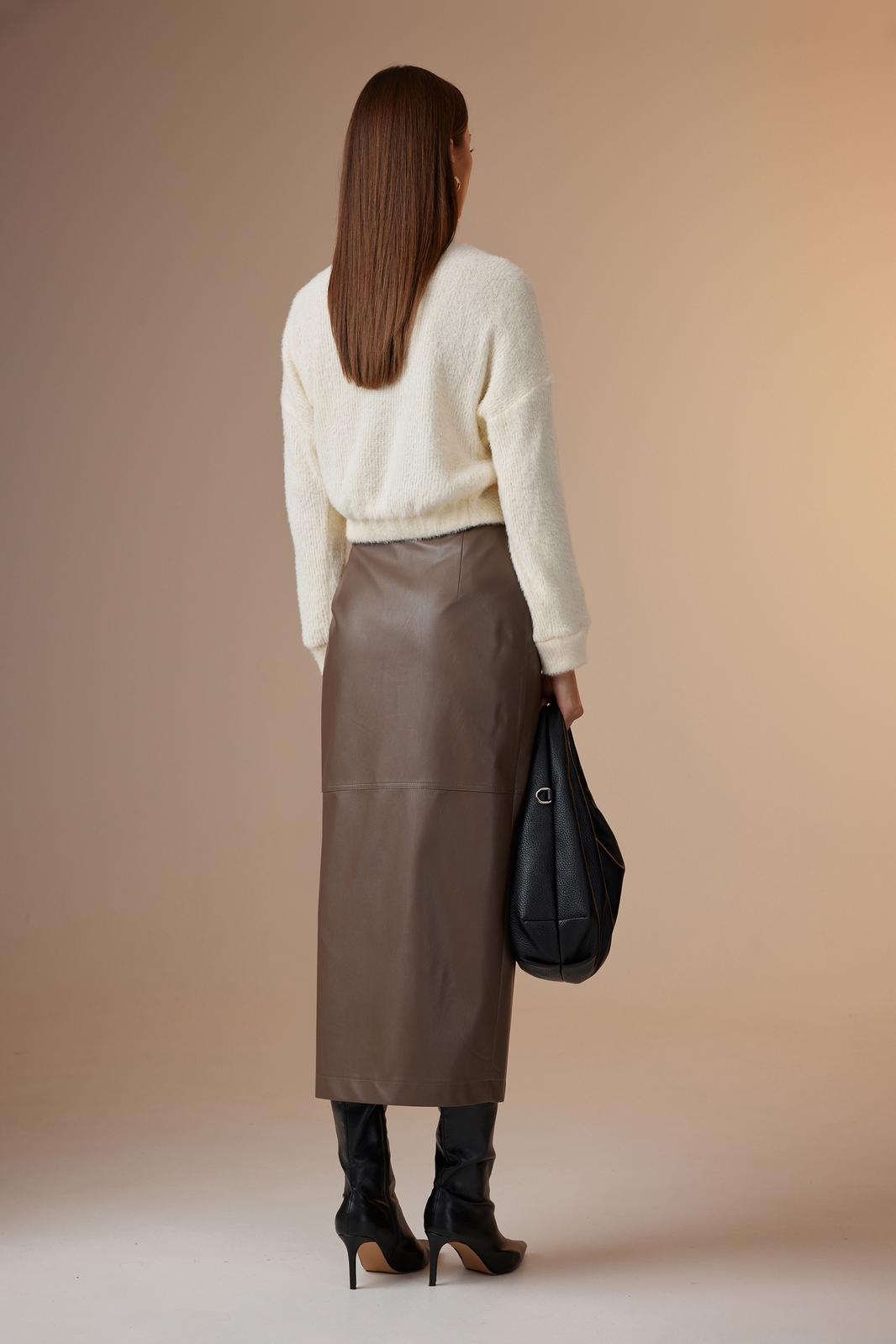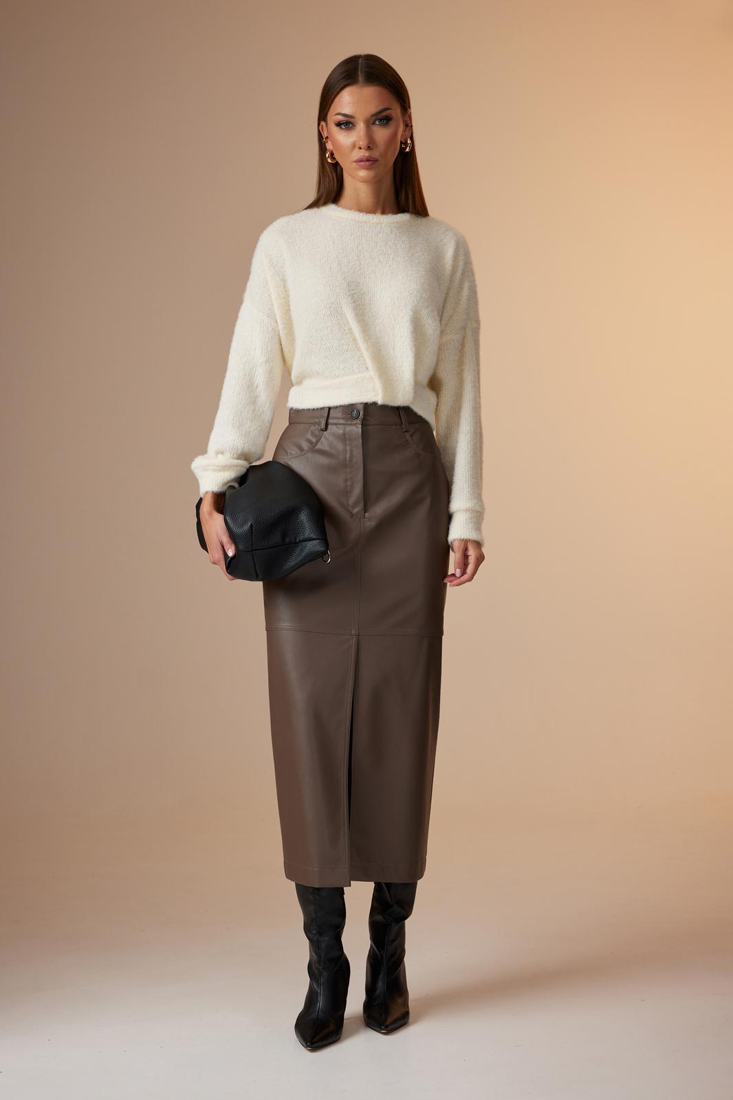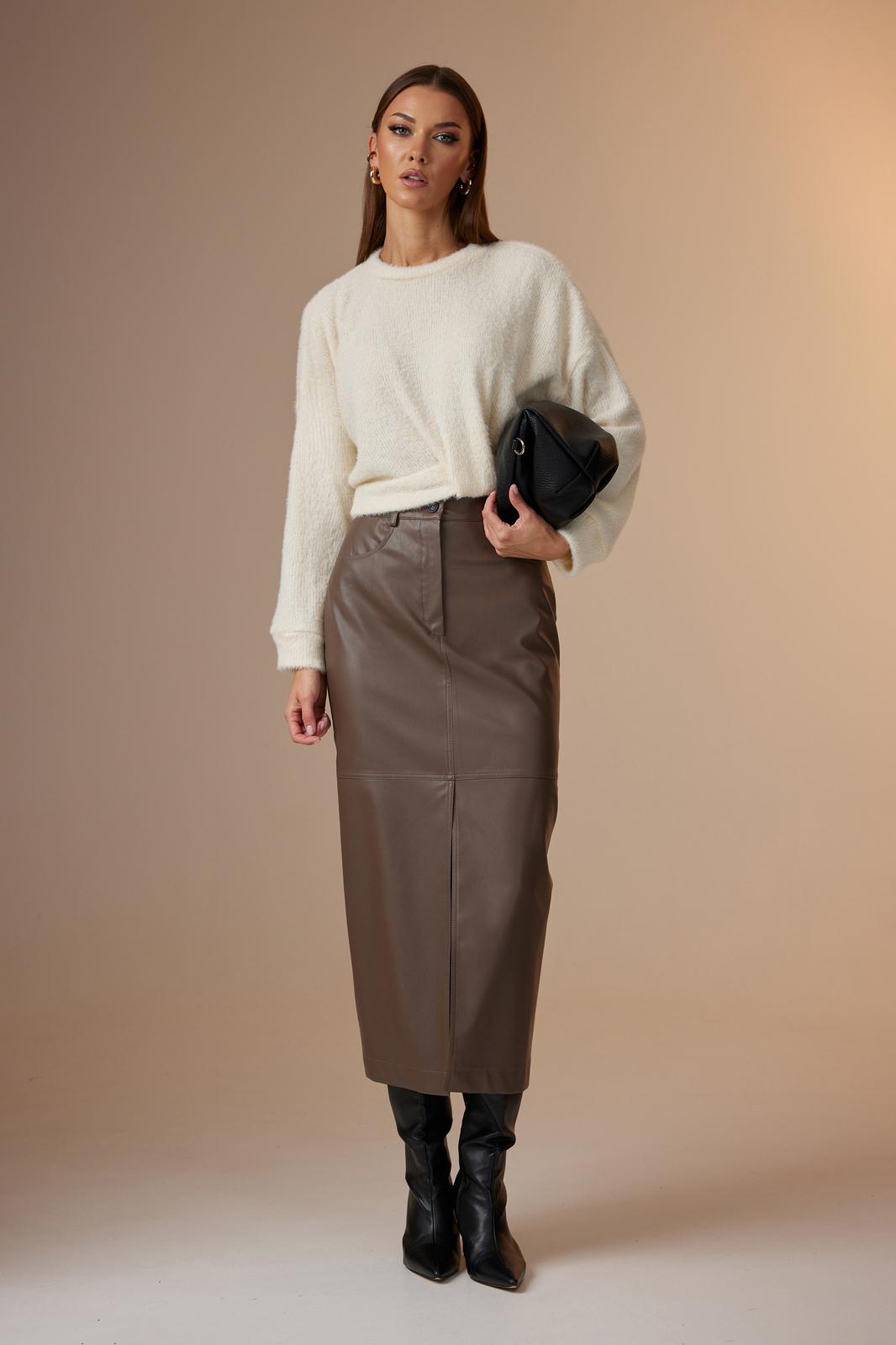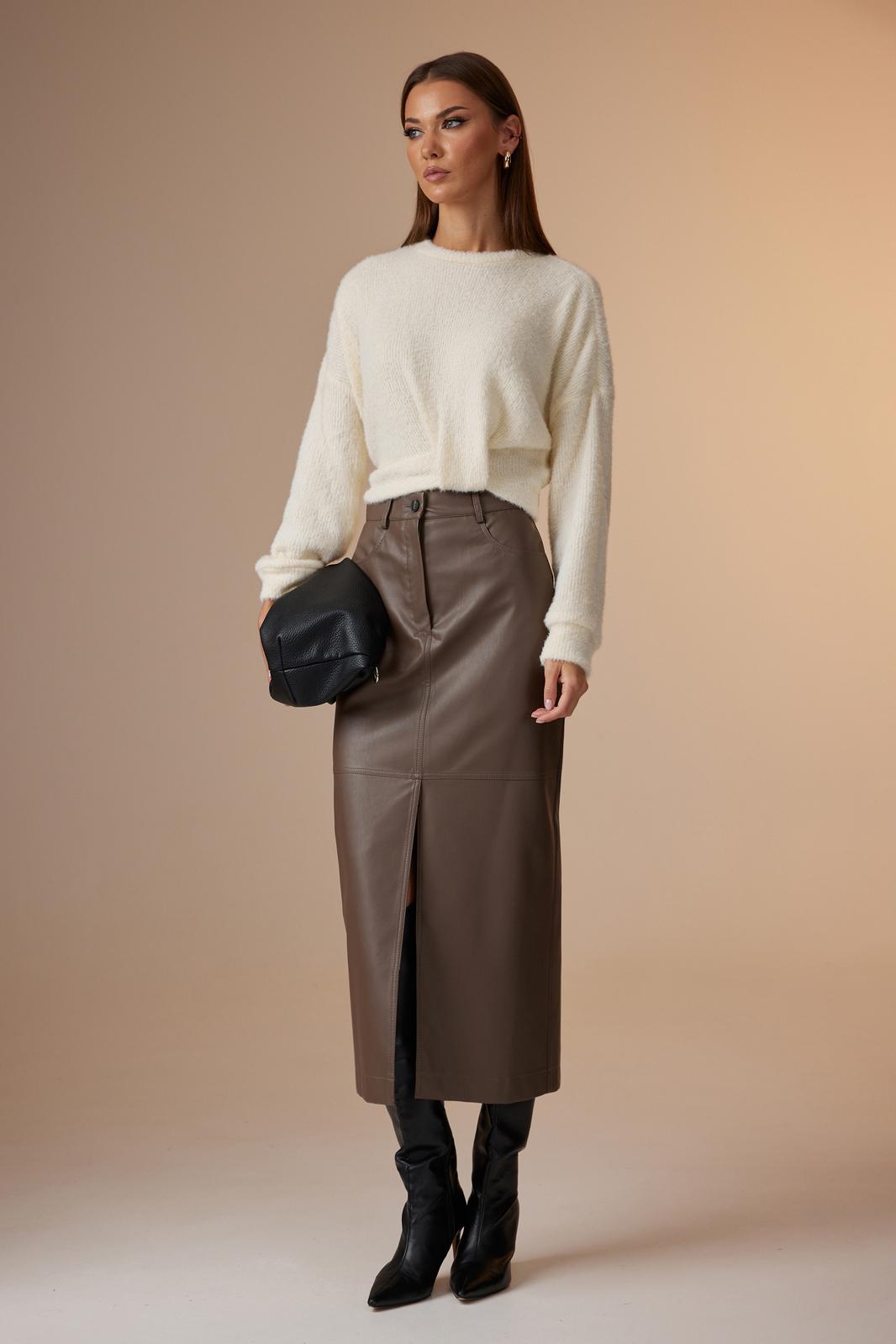 Комплект женский, состоит из трикотажного джемпера и юбки из экокожи.