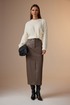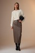 Юбка длинная, заужена к низу. Верхний срез юбки обработан поясом со шлевками для ремня. По переду расположен средний шов с застежкой на гульфик (тесьму-молнию) и разрезом. На переднем и заднем полотнище горизонтальный шов. В боковых швах переднего полотнища расположены карманы закругленной формы. Горизонтальные, вертикальные подрезы, застежка, карманы, пояс со шлевками отстрочены отделочными строчками.