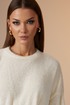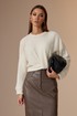 Джемпер укороченный, спереди до линии талии, сзади по низу на резинке, чуть ниже талии. Джемпер покроя спущенное плечо с длинным одношовным рукавом, заканчивающимся манжетой. По левой части переда заложены три декоративные складки. Горловина обработана бейкой из основной ткани. Перед имеет ассиметричную форму.