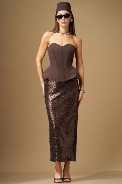 Юбка женская, зауженная книзу, с цельнокроеным поясом, на резинке. Заднее полотнище со средним швом, в котором расположен разрез. Юбка выполнена из ткани с пайетками, на трикотажной подкладке. Юбка длиной «мидакси».