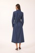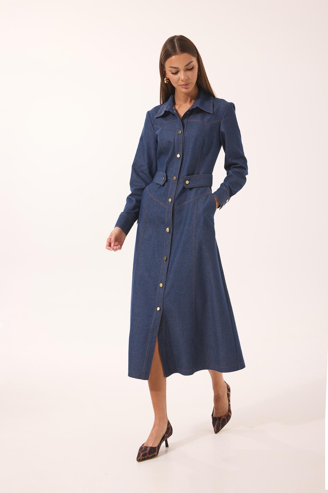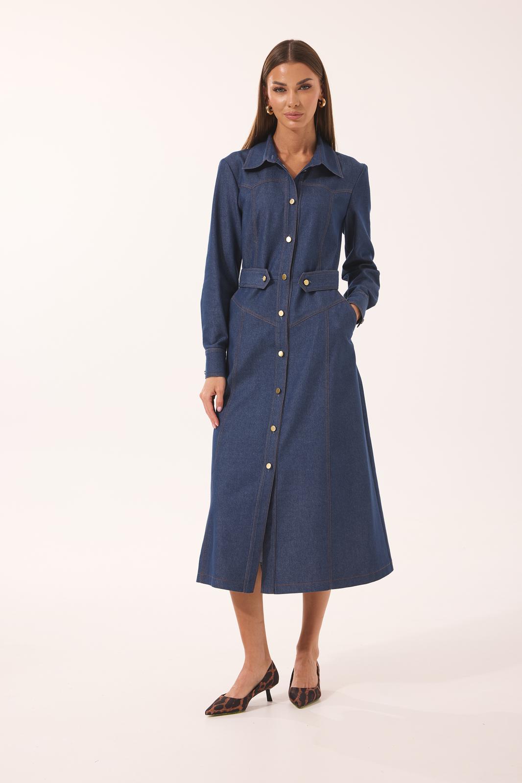 Платье женское полуприлегающего силуэта, втачного покроя, с центрально бортовой застежкой на планку на петли-пуговицы. Платье выполнено из джинсовой плательной ткани. Перед резной состоит из кокетки верхней, верхней центральной, верхней боковой частей, нижней кокетки переда, центральной нижней, боковой нижней частей. На переде так же расположены наклонные карманы, на талии хлястики, идущие от кулисы по спинке. Спинка состоит из кокетки, верхней части спинки, центральной и боковых частей. В центральной части по талии расположена кулиса с резинкой для лучшего прилегания. Рукав двушовный, полной длины, с манжетами по низу. Горловина оформлена стояче отложным воротником с отрезной стойкой. В модели используются отделочные строчки контрастного цвета, пуговицы так же являются отделкой и идут контрастного цвета.