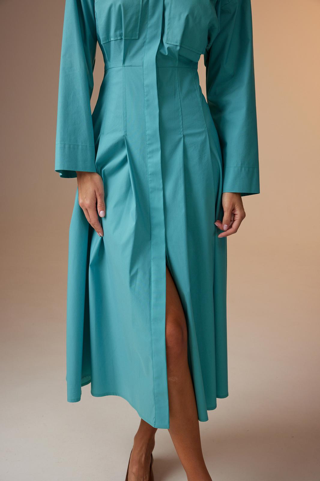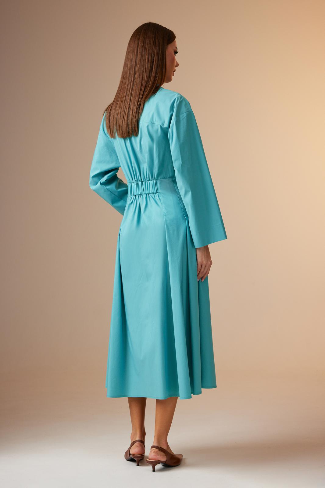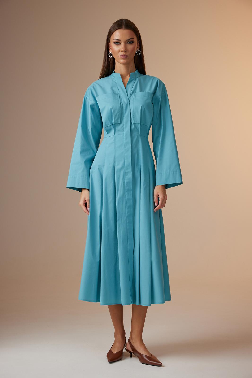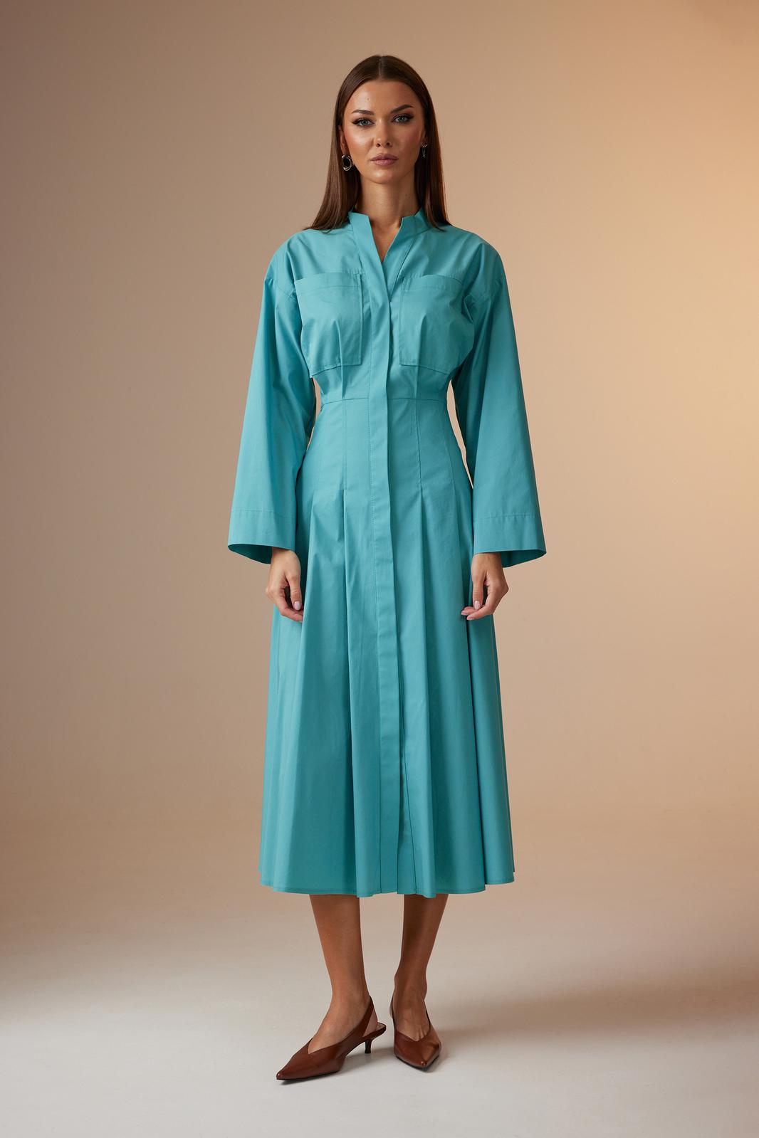 Платье женское, покроя спущенное плечо, с центральной потайной застежкой на петли-пуговицы. Планки застежки к горловине скошены и входят в отрезную стойку. Платье отрезное чуть выше линии талии, по центру спинки вставлена широкая резинка для хорошего прилегания. Нижние части спинки и переда расширенные, имеют по две складки, застроченные почти до линии бедер. Верхние части спинки и переда с кокетками. На центральной части переда накладные карманы и небольшие складки, которые являются продолжением складок на нижней части. Рукав длинный, прямой, достаточно широкий снизу.
