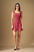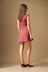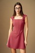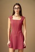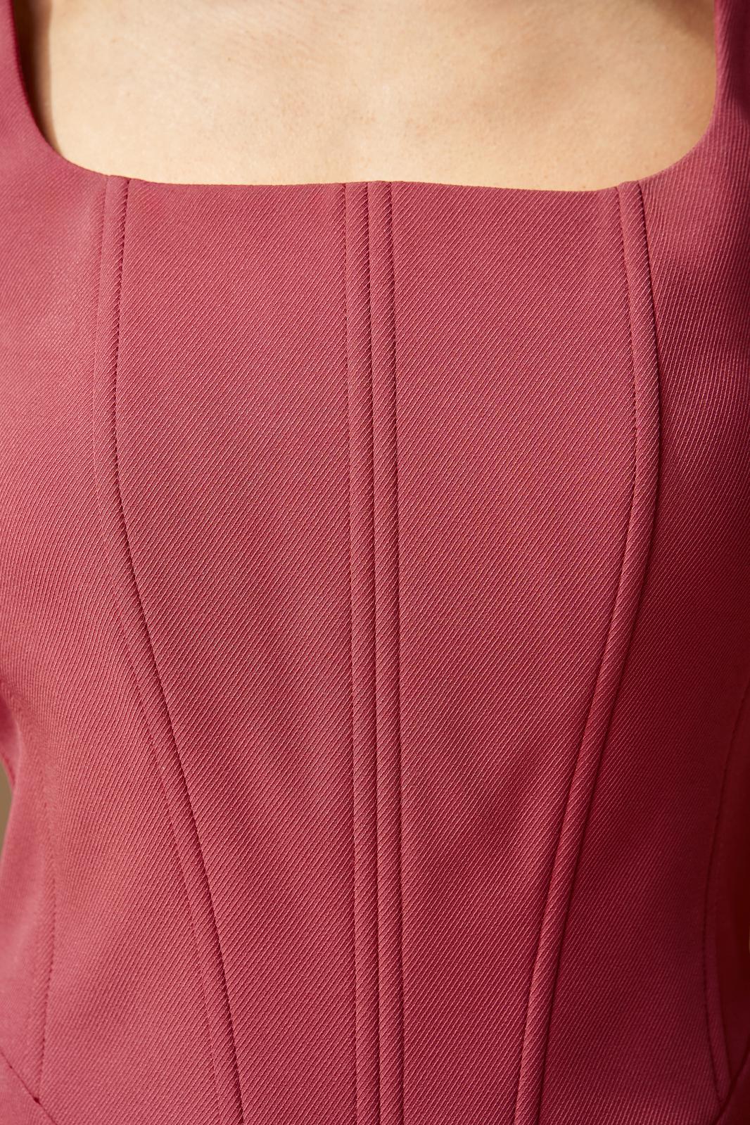 Платье женское приталенного силуэта, отрезное по талии, спереди углом. Верхняя часть переда платья выполнена в виде корсета, плотно прилегает, в рельефы вставлены косточки, на подкладке. Вырез фигурный, квадратной формы, плечо слегка расширено. Нижняя часть в виде короткой юбки – расширенного А-силуэта. По центру спинки вставлена потайная молния, так же для лучшего прилегания в верхней части есть бочок и вытачка.