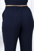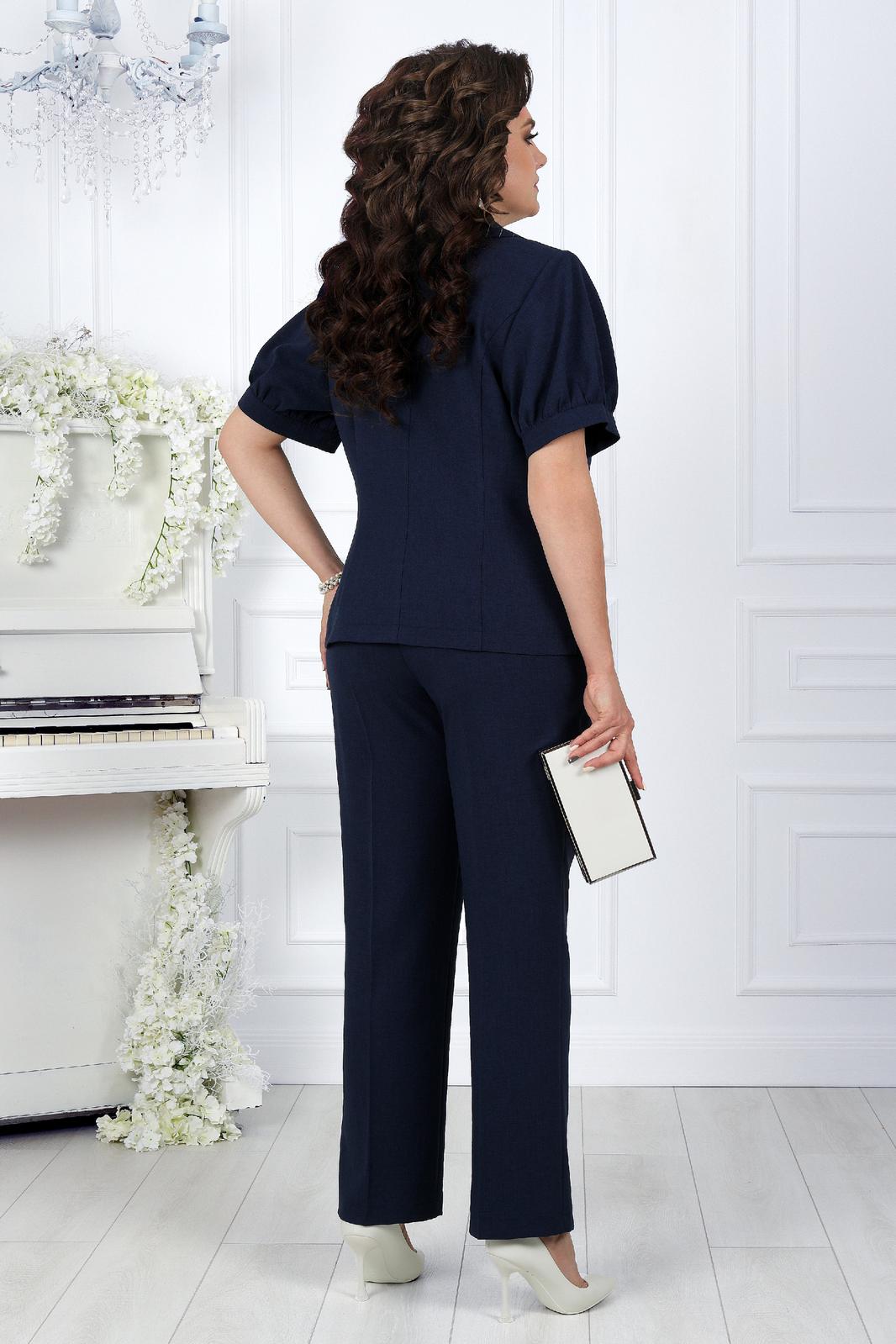 Брюки классические, с посадкой на талии, на притачном поясе, с застёжкой на тесьму-«молния», расположенную в среднем шве передних половинок, 1 петлю и 1 пуговицу на поясе. Передние и задние половинки брюк с талиевыми вытачками, идущими от пояса вниз, с заутюженными стрелками. На передних половинках брюк расположены наклонные боковые карманы. Для лучшего прилегания брюк в области талии в поясе со стороны спинки вставлена резинка.